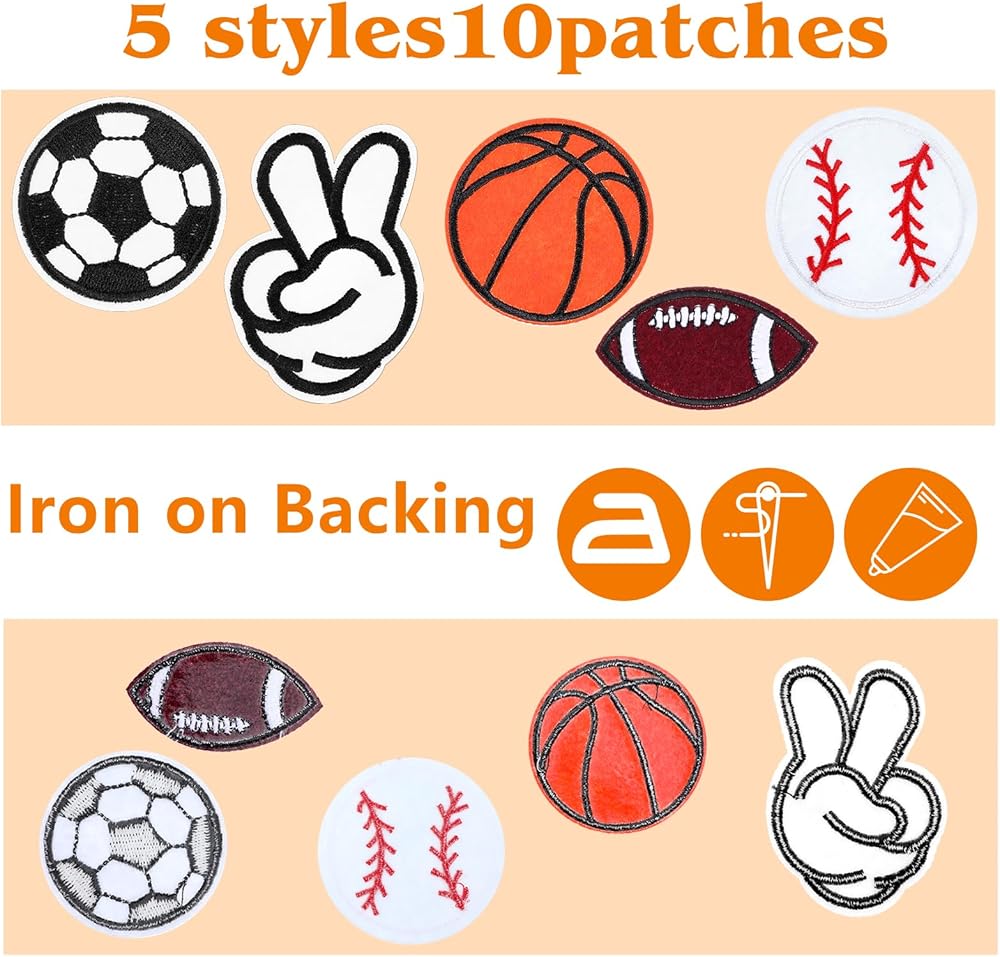 Sports Theme Patches: You will get 10 pieces of ball sport theme patches in 5 different patterns,with patterns of soccer, basketball, baseball, football and victory sign, with heat seal glue backing, easy to iron or sew, not easy to tear or fade, bright colors and wear-resistant.Rich styles and sufficient quantity to satisfy your various needs of crafts making
