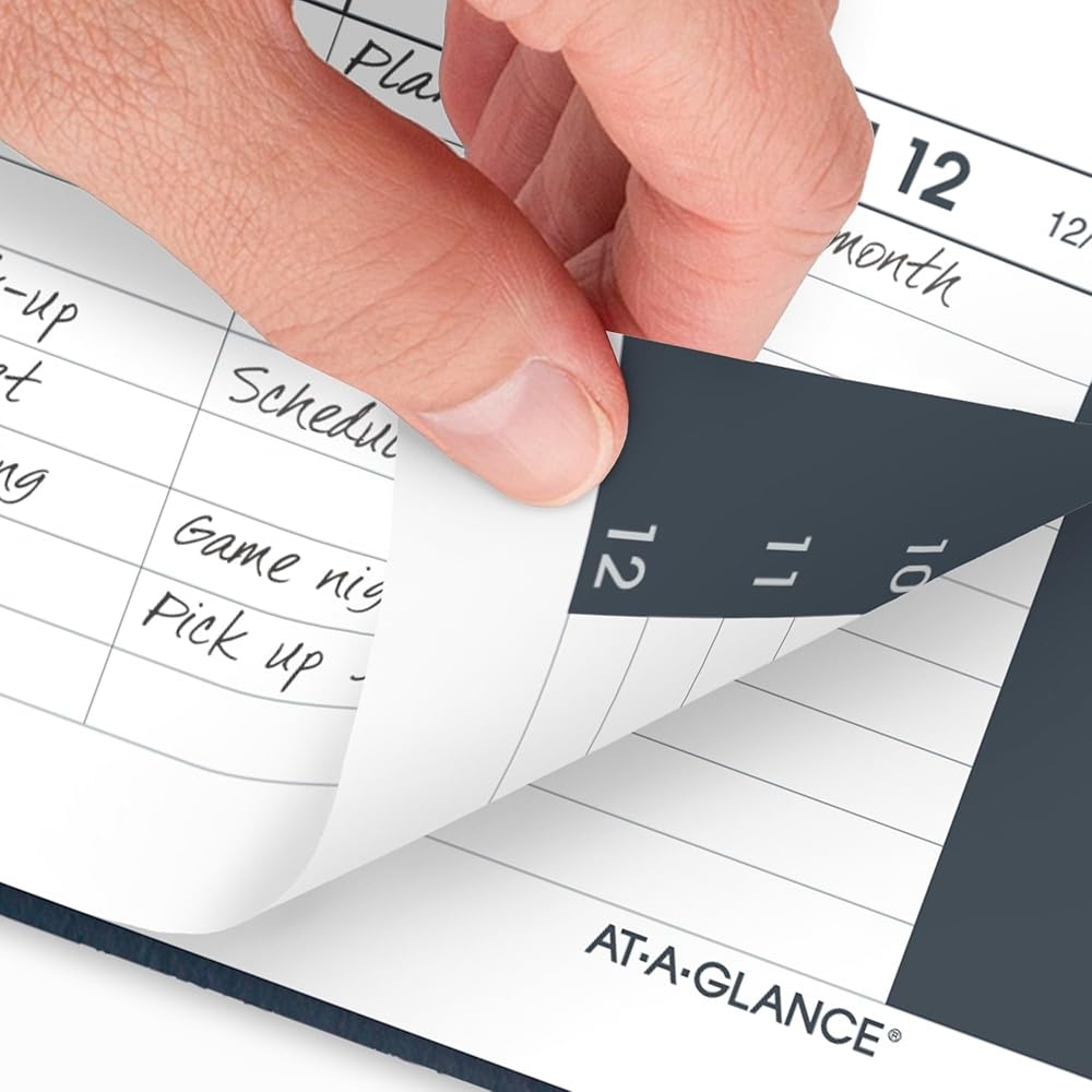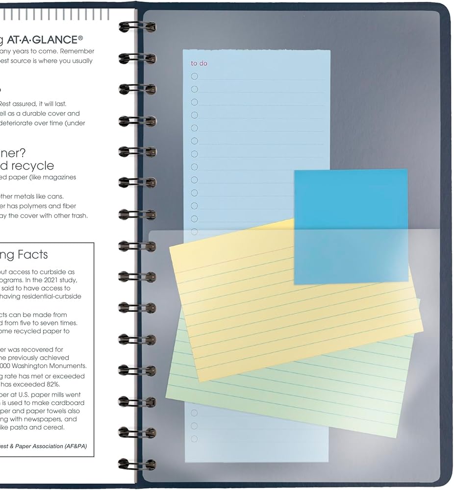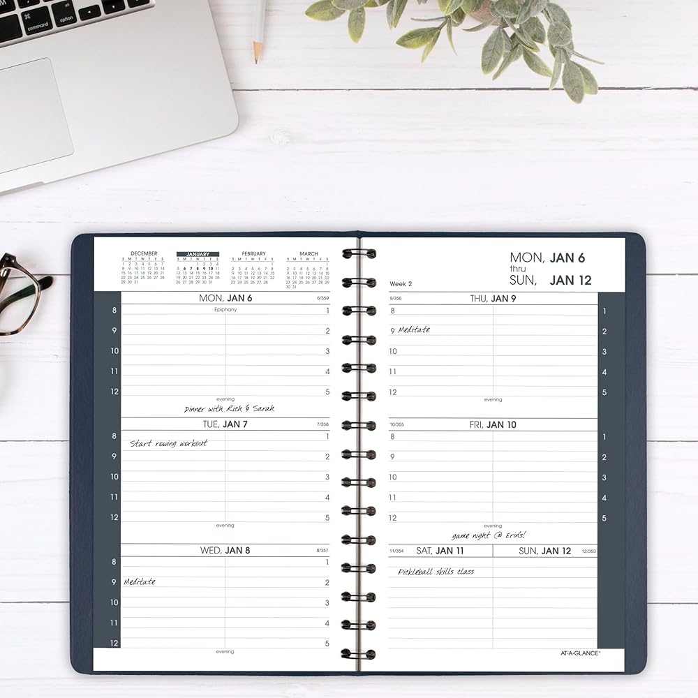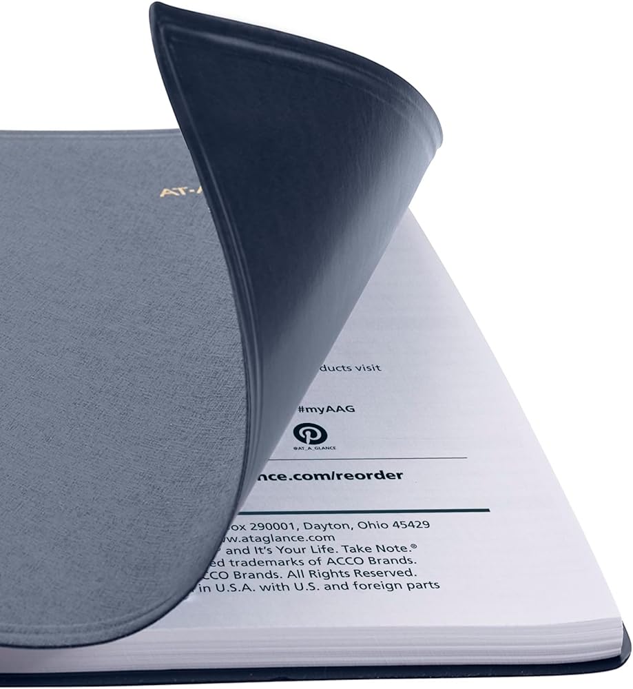 Keep track of upcoming appointments and due dates within the pages of a 2025 AT-A-GLANCE Weekly Appointment Book Planner. Each planner boasts an integrated double-sided storage pocket to organize loose homework sheets, brochures and more. Boasts 2 pages per week with hourly appointment times from 8 A.M. to 5 P.M. during the week with reference calendars. Weekends are condensed and untimed. Special features include a 3-year reference calendar, personal information page and a contacts page. Covers 12 months: January to December. Double-sided pocket holds loose sheets. Pages are resistant to ink bleed. Securely wire-bound within the faux leather cover. Faux Leather is a synthetic material. See specs for details.