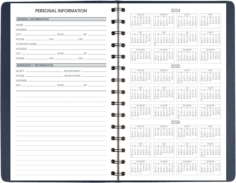 Special features include a 3-year reference calendar, personal information page and a contacts page.