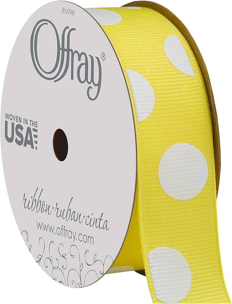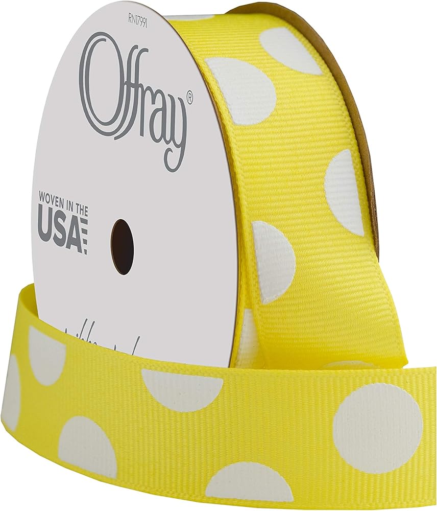 A great addition to your craft supplies that can be used in home décor, arts and crafts activities, sewing, gift wrapping, and any other DIY project, our Dippy Dot Pattern ribbon is as versatile as it is colorful! Packaged in a 3-yardspool, this ribbon measures 7/8" wide and comes in a Maize Yellow and White Polka Dot Pattern. Proudly made in the United States.