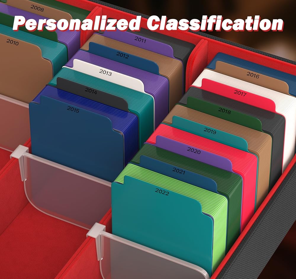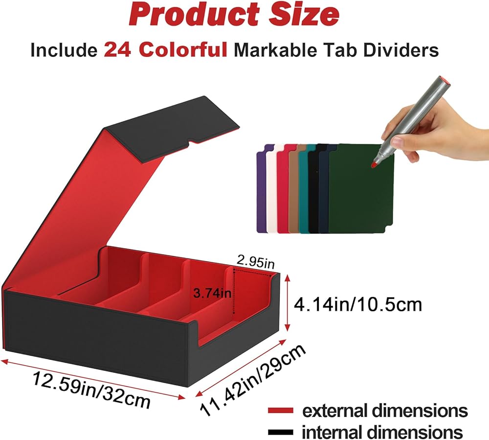 من خلال دعم البطاقات والمزارع الملونة: يأتي صندوق تخزين البطاقات الخاص بنا مع 4 فواصل قابلة للتعديل للبطاقات للحفاظ على بطاقاتك منتصبة ومنظمة ؛ ويشمل أيضًا 24 فرد ألوان يسهل تنظيم وتصنيف البطاقات لتحسين الكفاءة