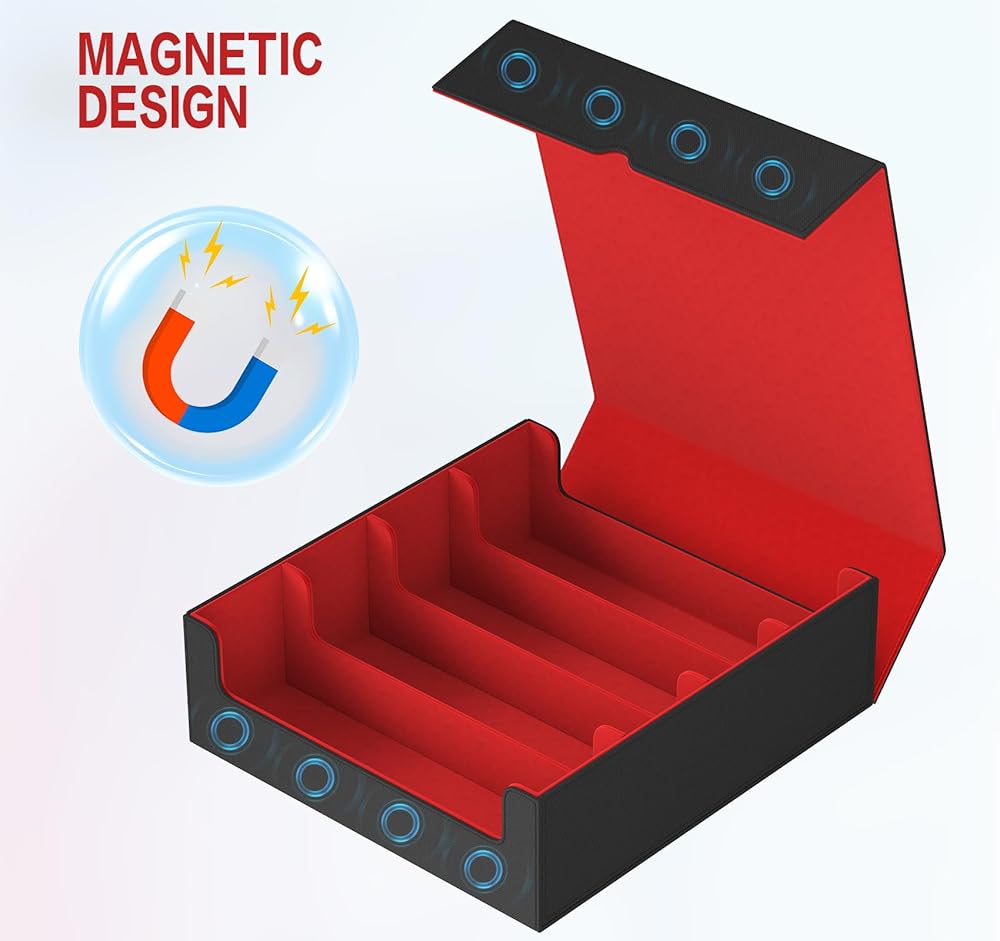 التصميم المغناطيسي: يستخدم صندوق سطح MTG المكون من 4 صفوفنا تصميمًا قويًا للإغلاق المغناطيسي لمنع البطاقات الخاصة بك من السقوط بسهولة ؛ إن تصميم الإغلاق المغناطيسي القوي هو إنساني للغاية وعملي يضمن أن حالة سطح السفينة تظل مغلقة بشكل آمن ، حتى عند تربيتها