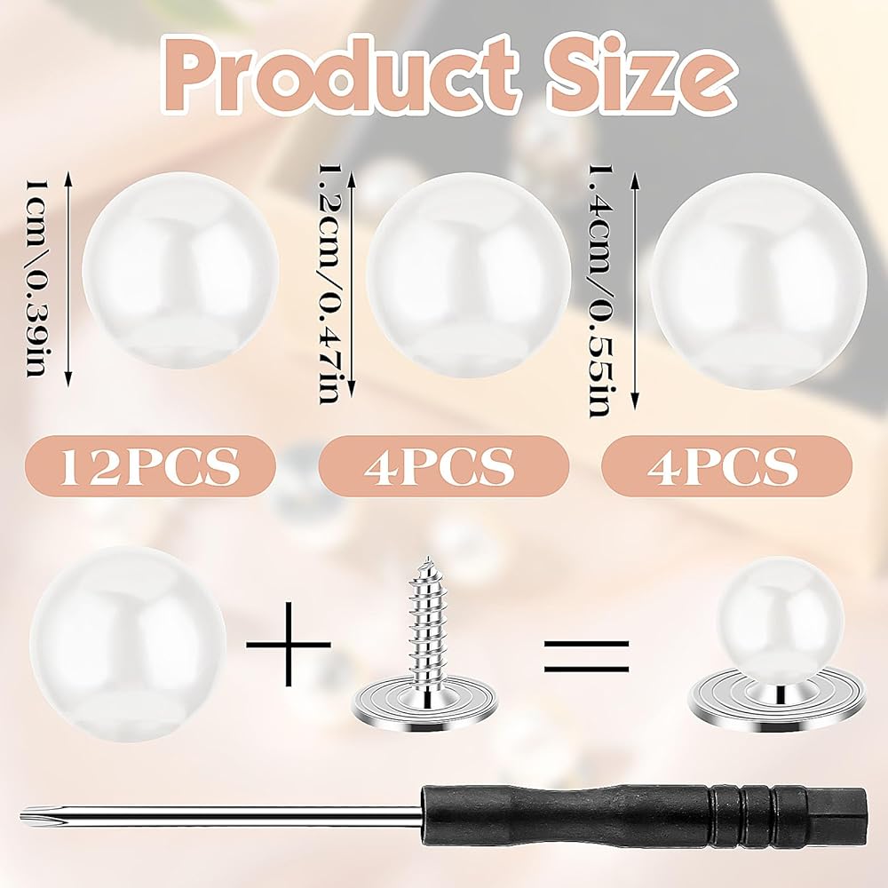 20 sets of pearl brooch buttons. 12 sets 10mm pearl buttons, 4 sets 12mm pearl buttons, 4 sets 14mm pearl buttons, 1 pc screwdriver