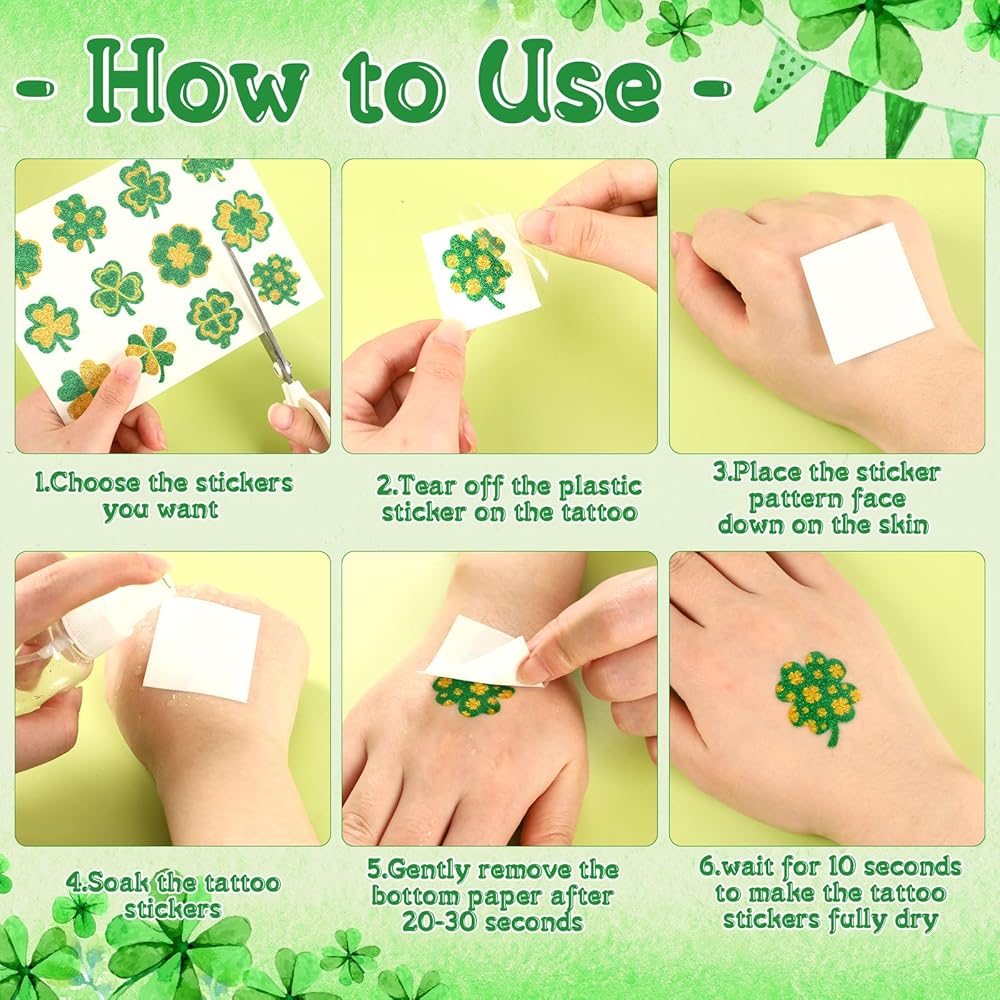 【سهلة الاستخدام】 تمزيق الفيلم الواقي من الوشم اللامع في عيد القديس باتريك ، والتمسك الجانب المنقوش على بشرتك ، وبلل ملصقات وجه شامروك بريق لمدة 20-30 ثانية ، ثم تمزيقها ببطء وجافة. يمكن تطبيق ملحقات عيد القديس باتريك هذه في أي مكان على بشرتك وتستمر لمدة 2-3 أيام ، وهي مثالية لتزيين عيد القديس باتريك. إذا كنت ترغب في إزالة الوشم المؤقت لعيد القديس باتريك ، فيرجى استخدام زيت الطفل