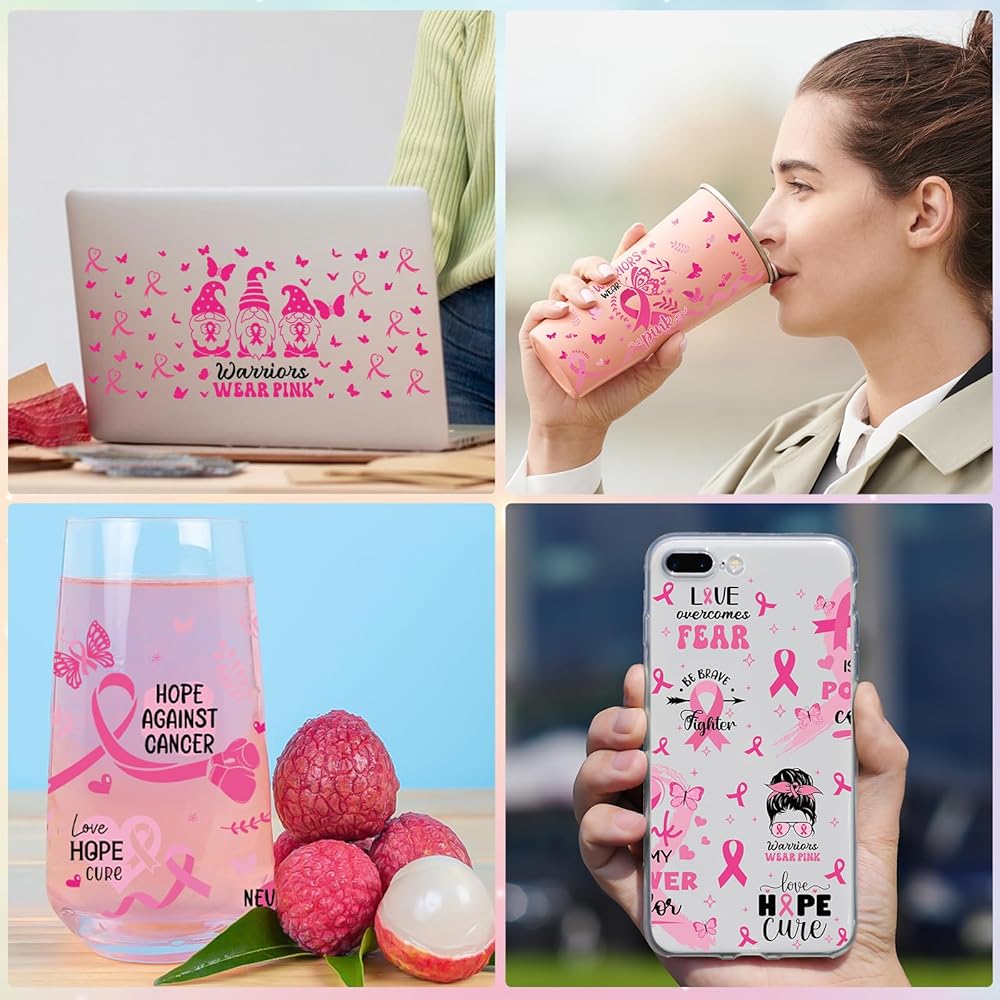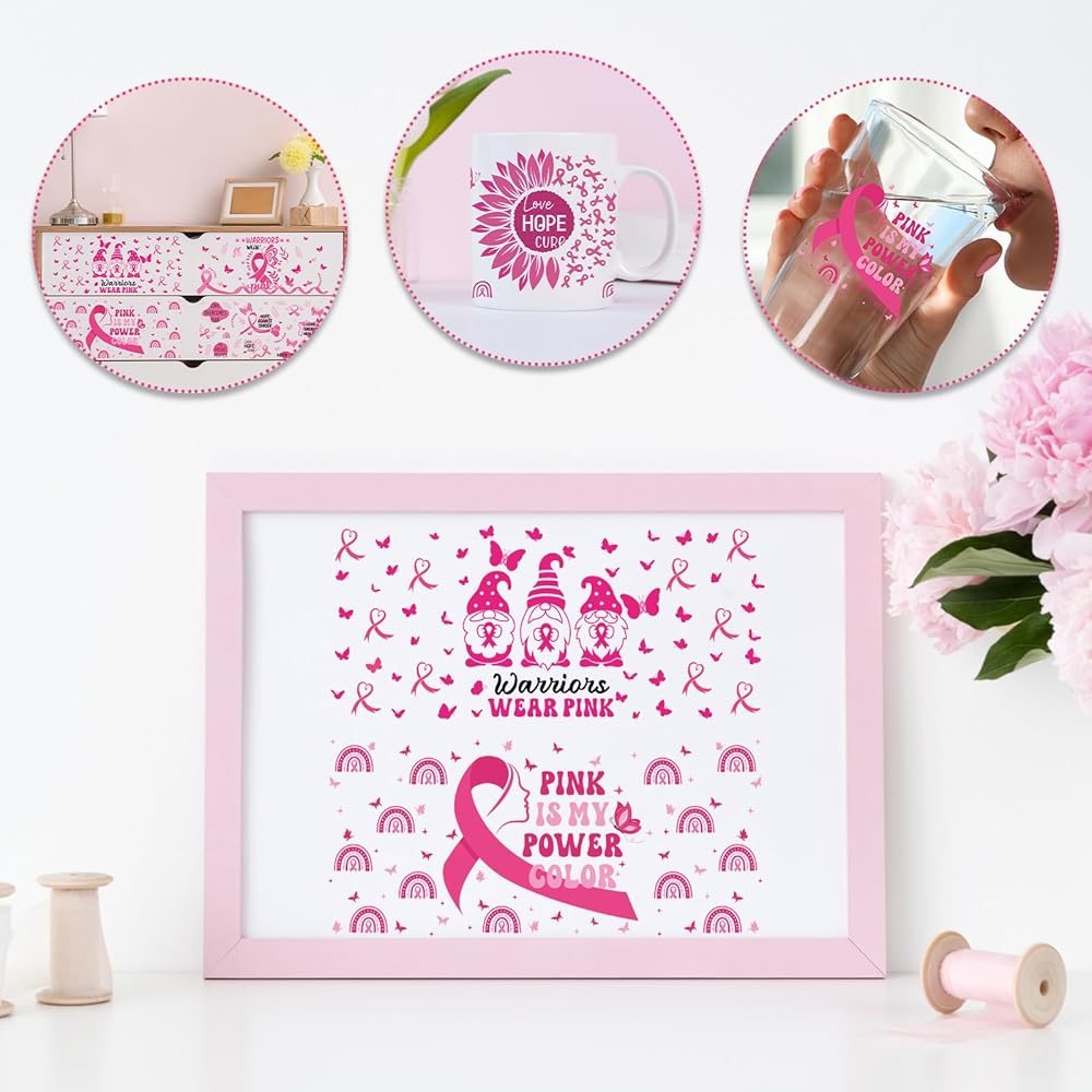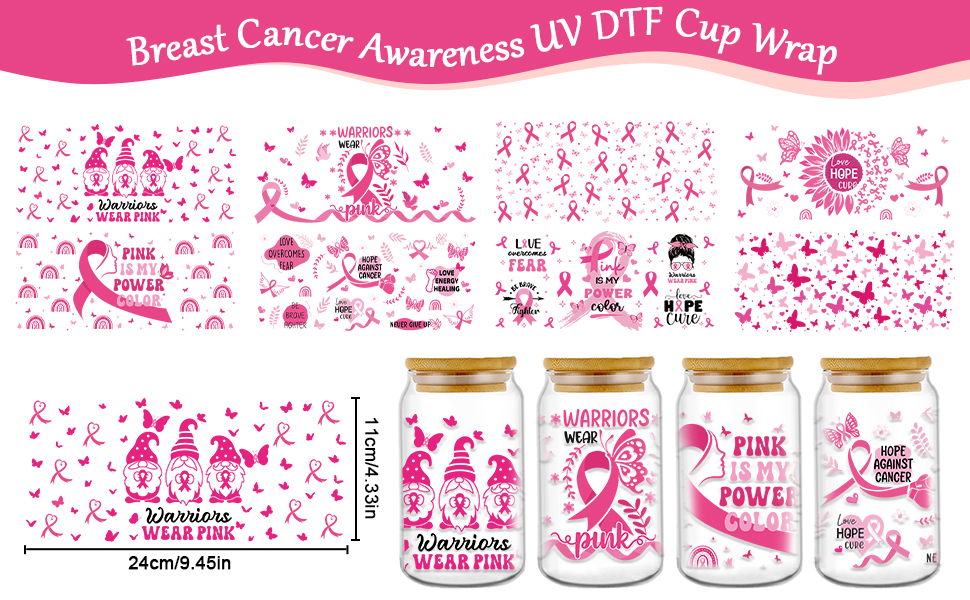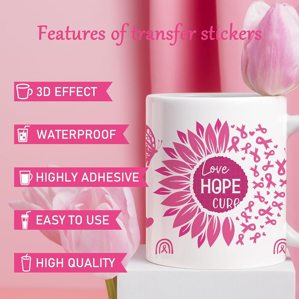 تصاميم فريدة: يرفع كوب DTF الشريط الوردي للأشعة الورقية لمدة 16 أوقية حوالي 24 × 11 سم/9.45 × 44.33 بوصة. هذه الفرك على ملصقات النقل هي ديكور الوعي بسرطان الثدي المثالي