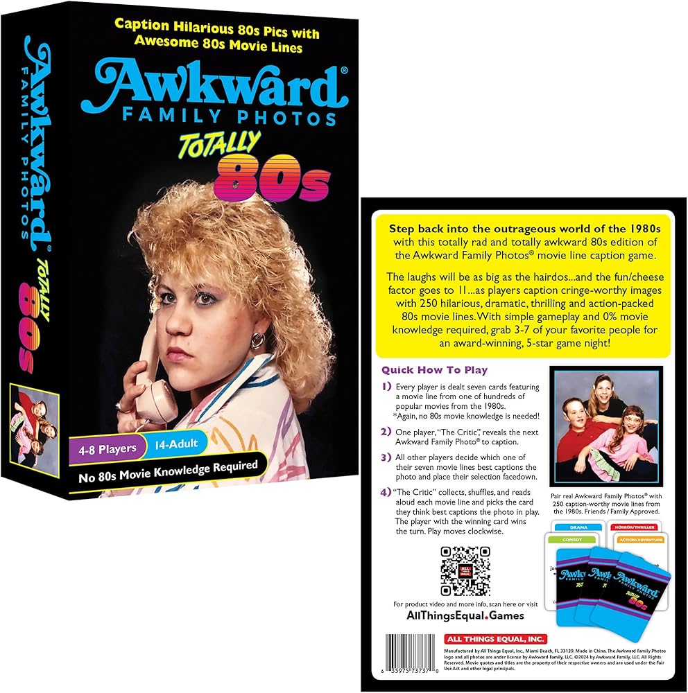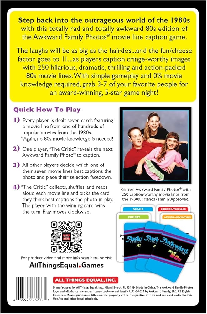 Inside this box are 100 comedic, dramatic, thrilling, and action-packed movie lines you, your friends and family will use to caption 40 of the greatest images. With easy rules and no movie knowledge required, play with the enclosed cards or add them to the original Greatest Hits game for hours of fun. Ages: 13-Adult / 4-8 Players. Features: 100 NEW Movie Line Cards, 20 double-sided Awkward Family Photo Cards (40 NEW images) and a Card Box to hide/hold photos during play.