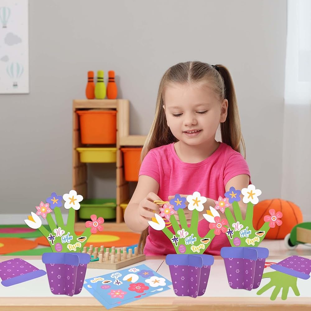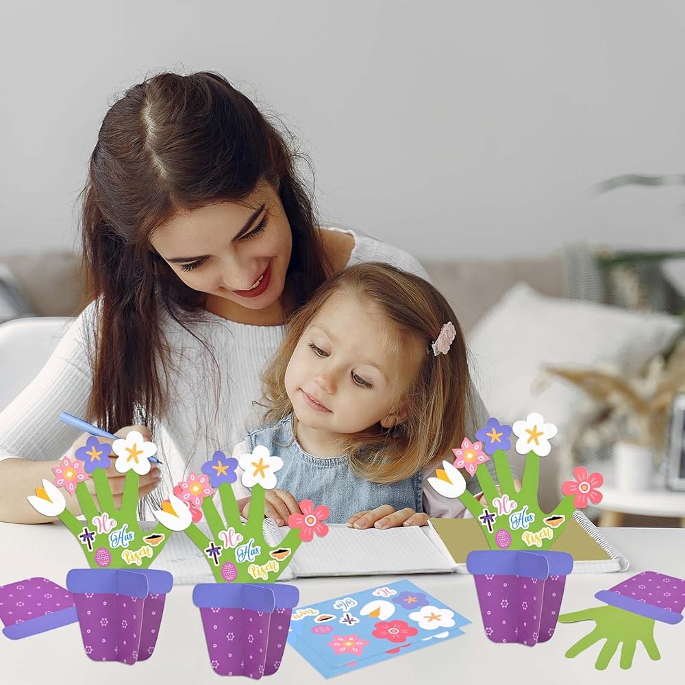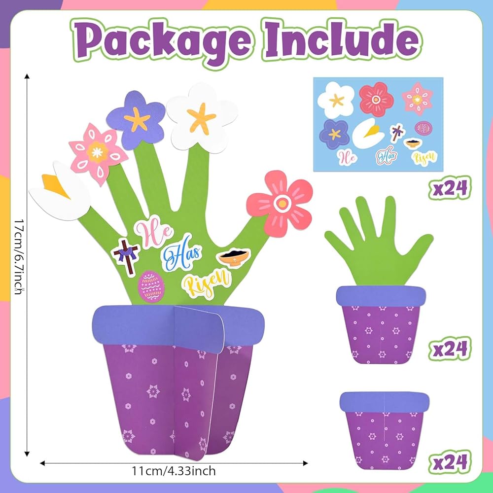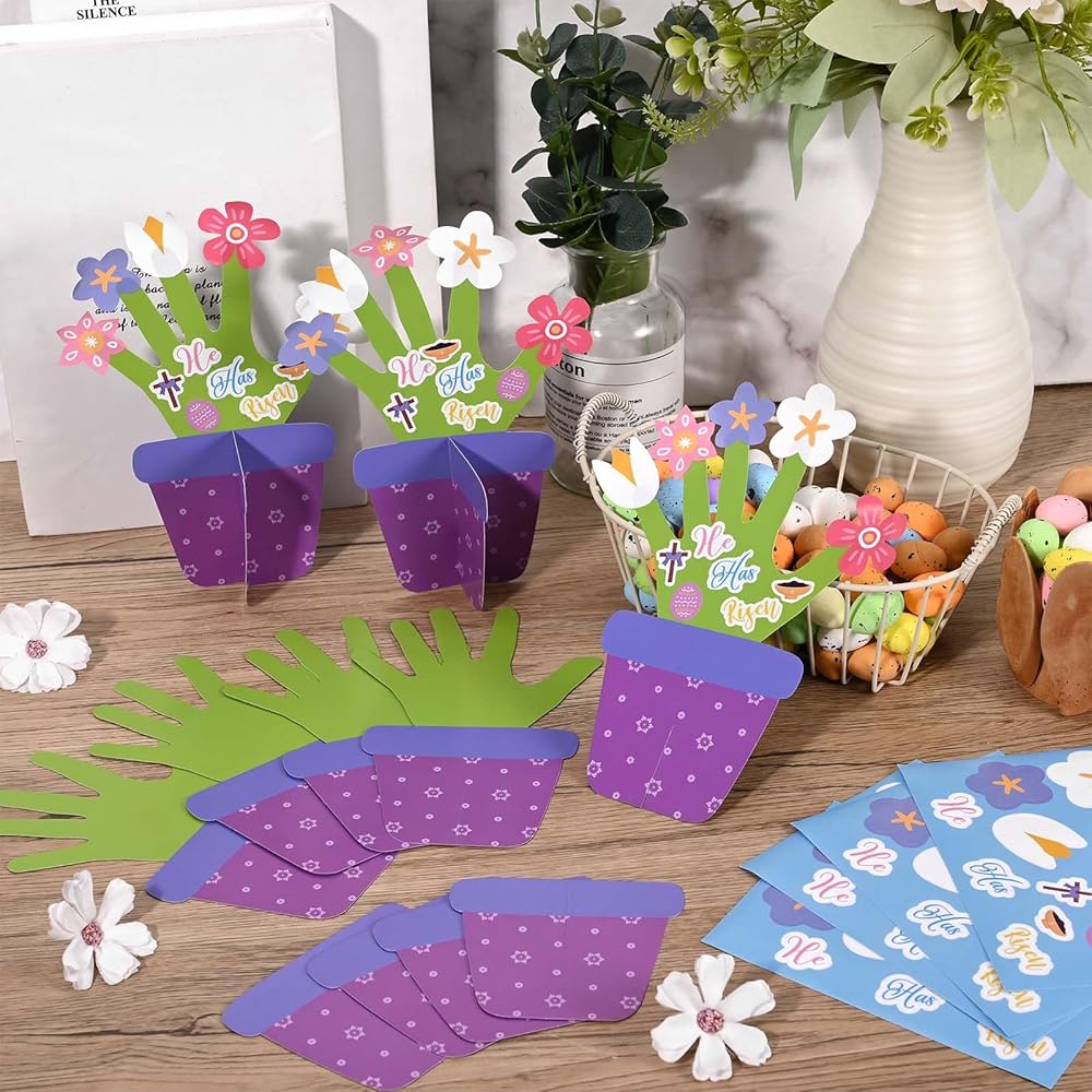 Easter Craft Kit: This Easter craft kit features handprint and flowerpot designs, with stickers that incorporate Easter elements and the phrase "He has Risen," adding to the festive atmosphere.
