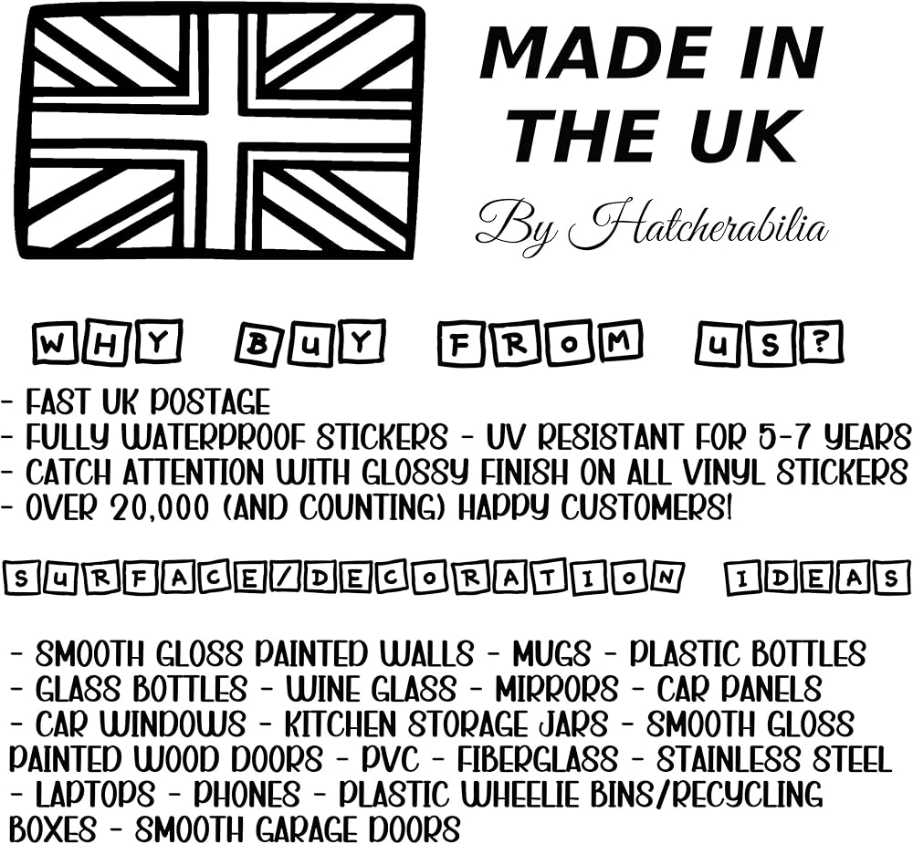 RECOMMENDED USE: Small stickers for use as - Car Stickers, Window Stickers, Car Window Stickers, Laptop Stickers, Helmet Stickers, Wall Stickers, Fridge Freezer Stickers, Tile Stickers, Wheelie Bin Stickers, Stickers for Children, Mirror Stickers, Wing Mirror Stickers, Vinyl Stickers, waterpoof adhesive vinyl but can also be removed without leaving any damage to a surface.