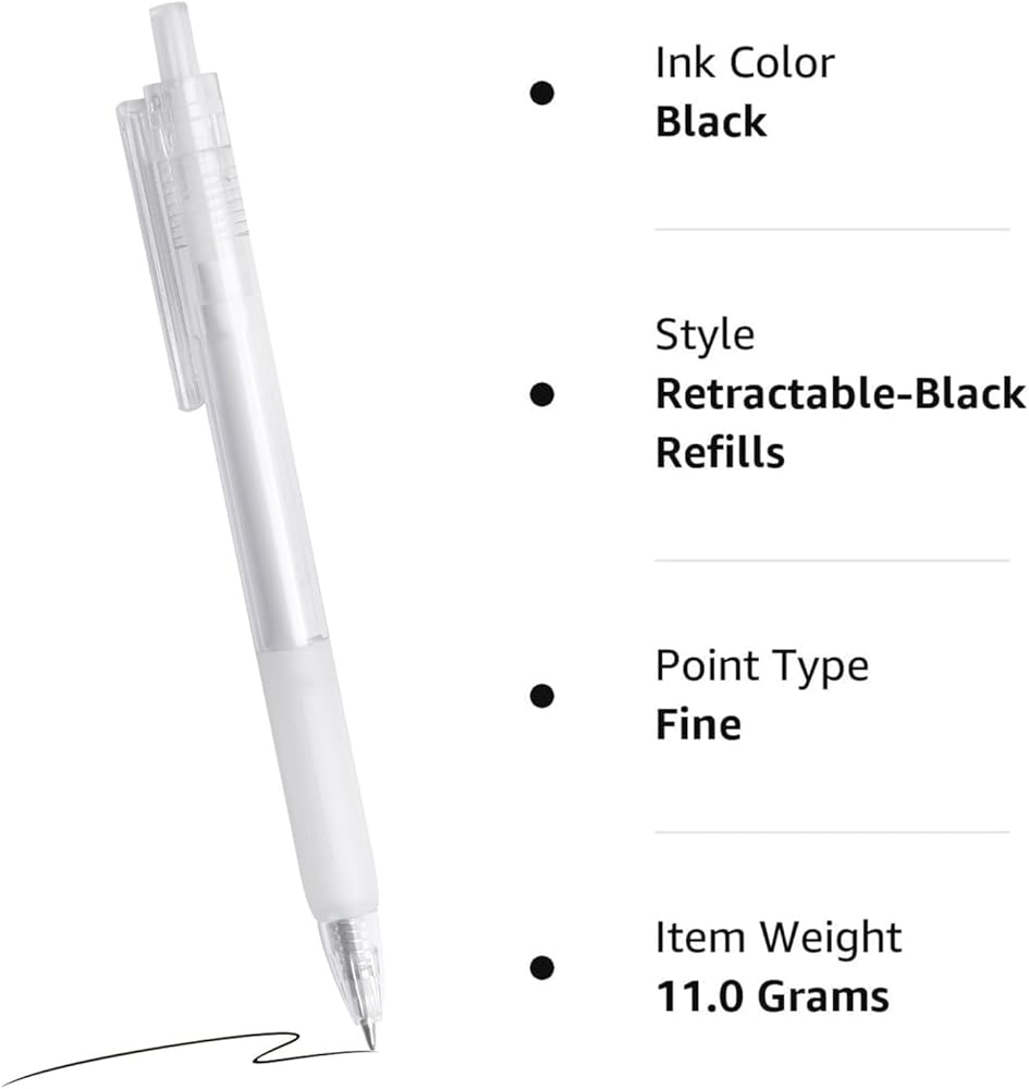 تجربة الكتابة السلسة: تضمن أقلام هلام الحبر السوداء 12 حزمة ، ونقطة دقيقة 0.5 مم الدقة في حين توفر تدفق حبر الهلام السلس خطوطًا متسقة وحيوية لتدوين الملاحظات ، وصياغة ، ورسوم الرسوم دون حبر أو تكتل.