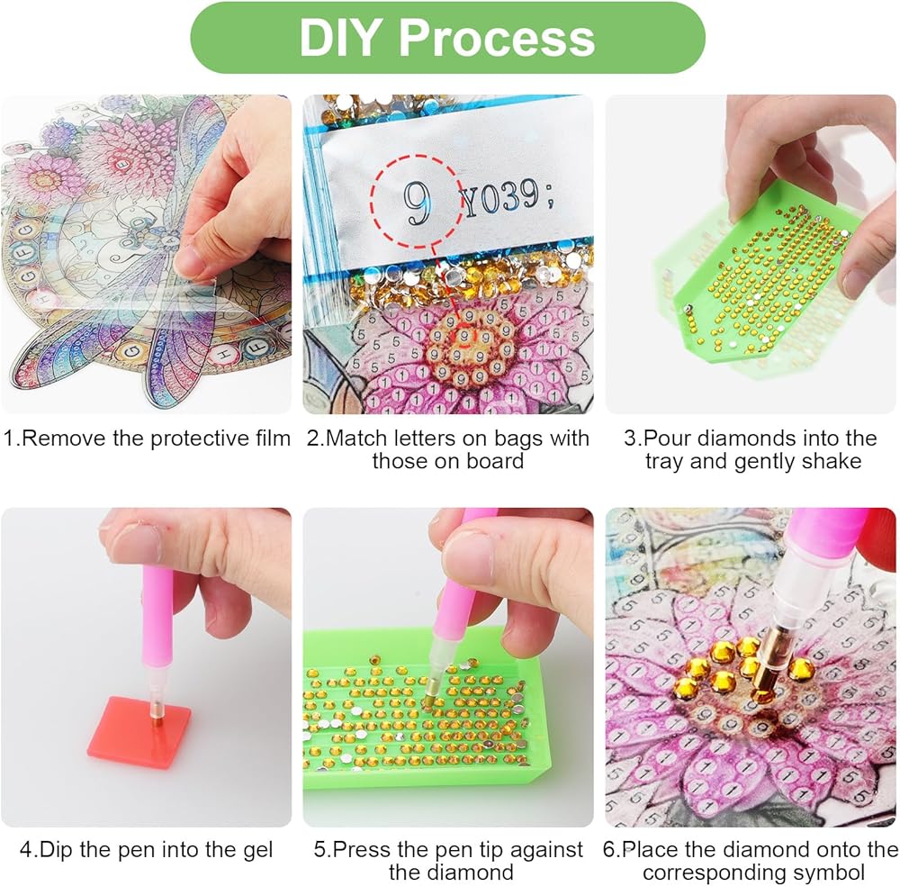• جذب العين: نقاط الماس على الوجهين مع أزهار ملونة وأنماط اليعسوب ، يعكس سطح الماس الكامل البريق الفوار تحت الضوء