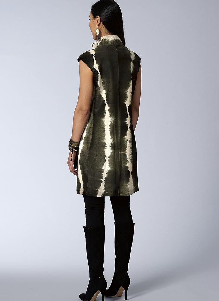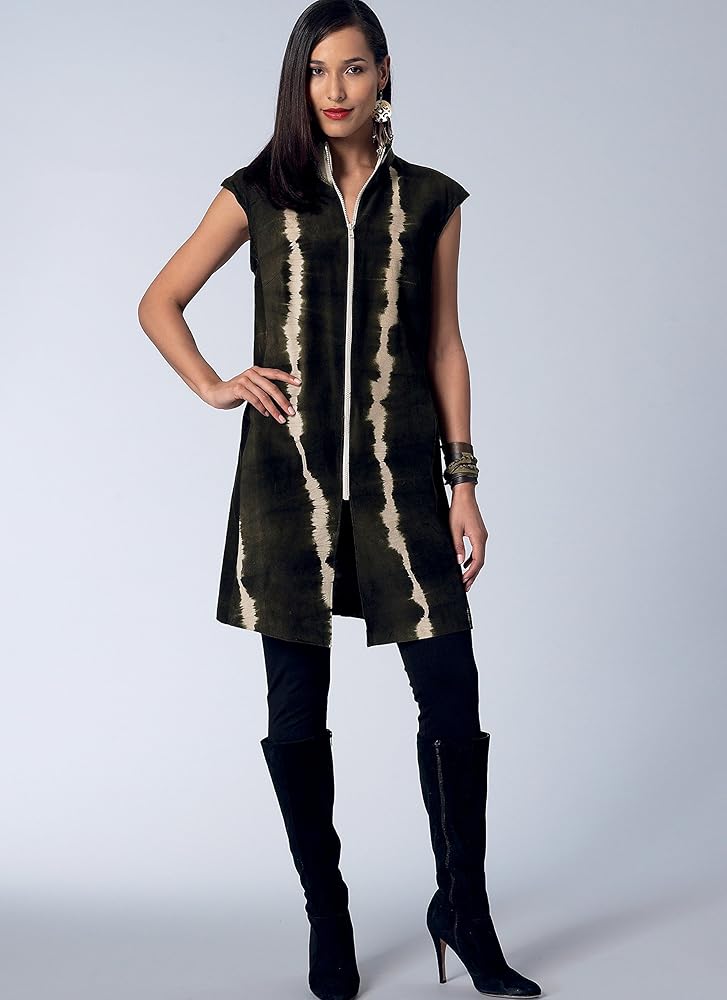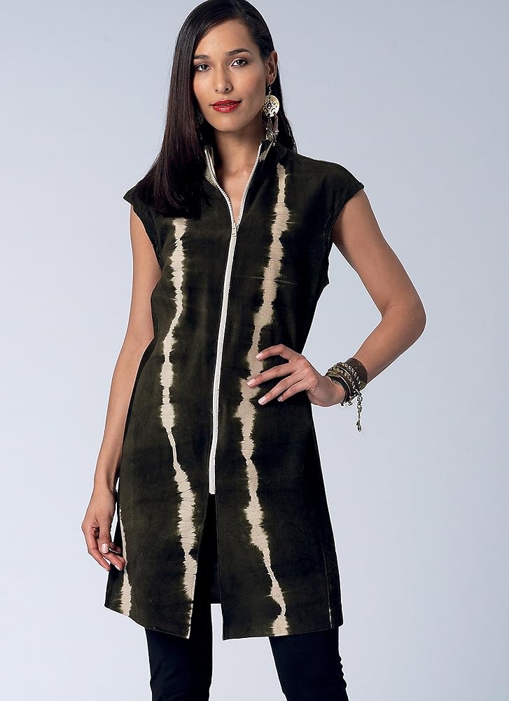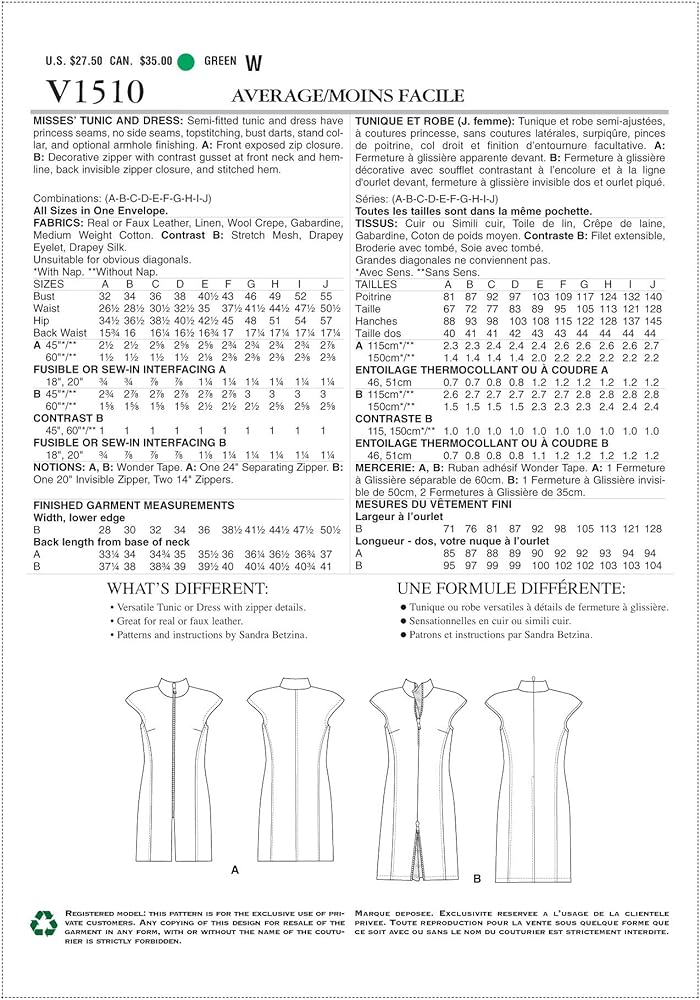 Semi-fitted tunic and dress have princess seams, no side seams, topstitching, French darts, stand-up collar, and optional armhole finishing. A: front exposed zip closure. B: decorative zipper with contrast gusset at front neck and hemline, back invisible zipper closure, and stitched hem. Real or faux leather, linen, wool Crepe, Gabardine, medium-weight cotton. Contrast B: stretch mesh, Drapey eyelet, Drapey silk. Unsuitable for obvious diagonals.