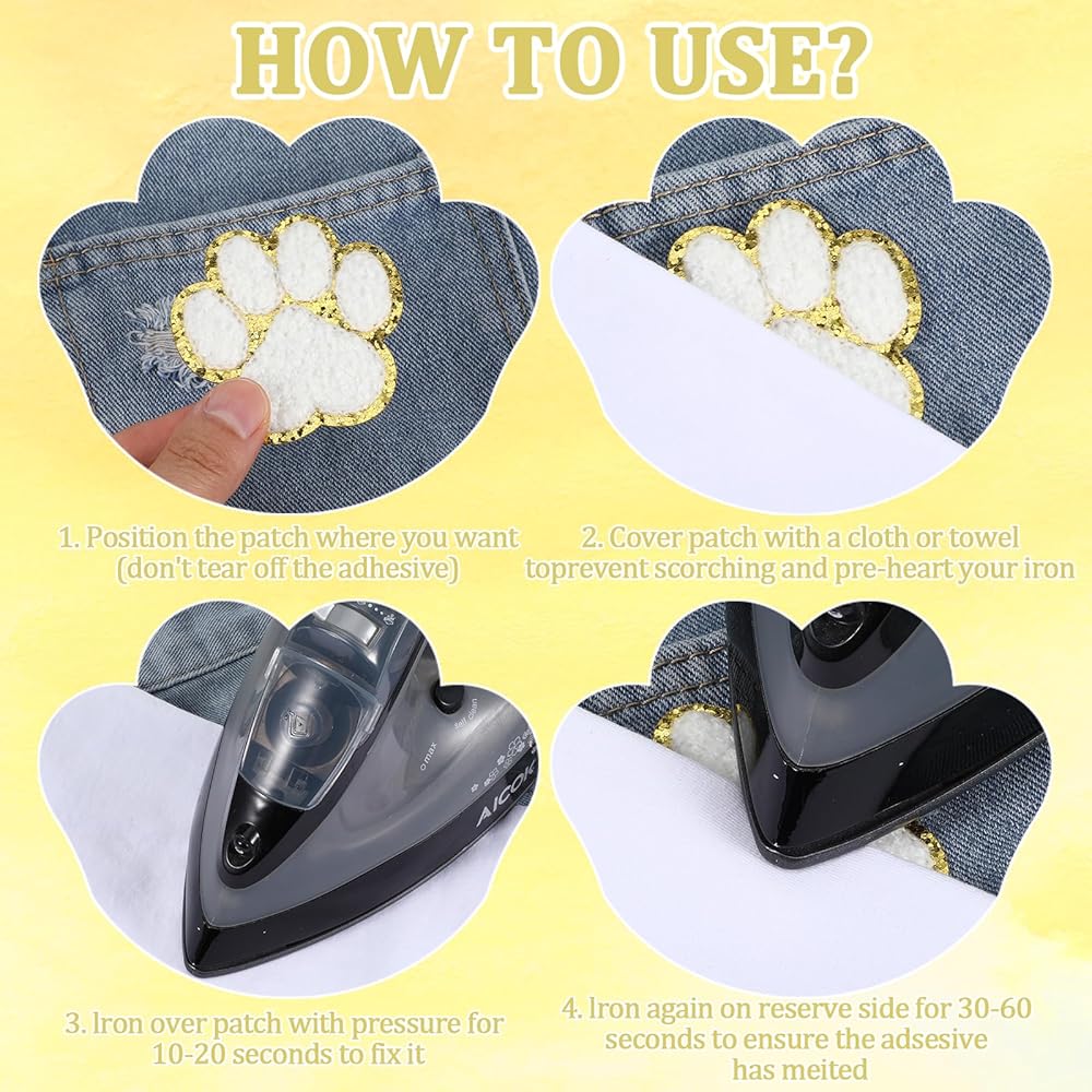 【Easy to Use】First place the sticker patches on the designated position, set the iron to 140℃, iron back and forth for 15-30 seconds, do not let the clothing adhesive patches overheat. For better results, turn the clothes over and iron again, then cool for 1 hour before employ. If you want the pet paw print iron on patch to be more durable, you can sew the cotton patch with needle and thread to reinforce