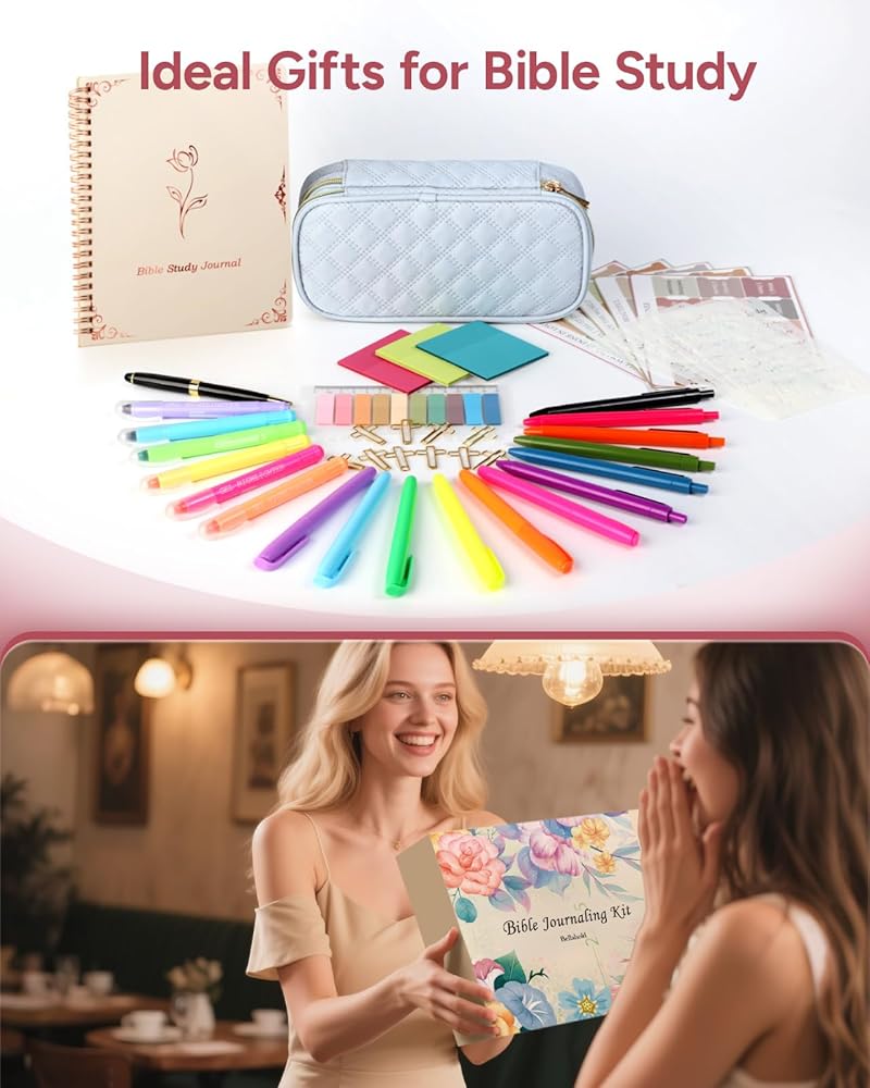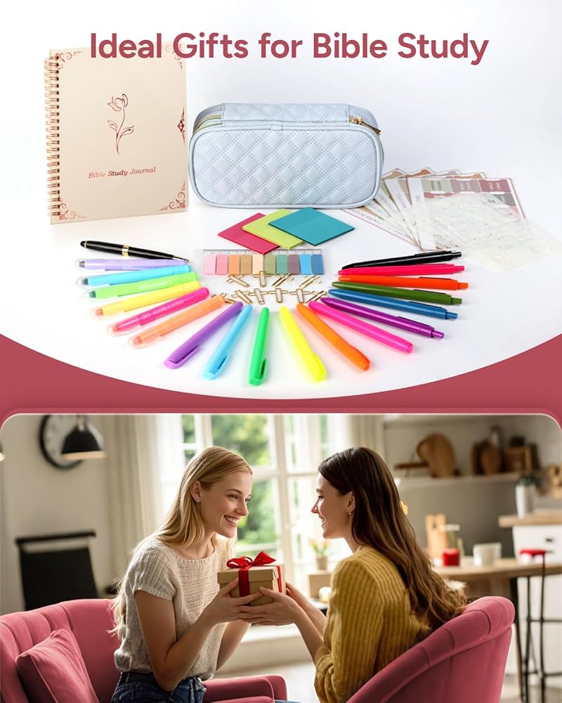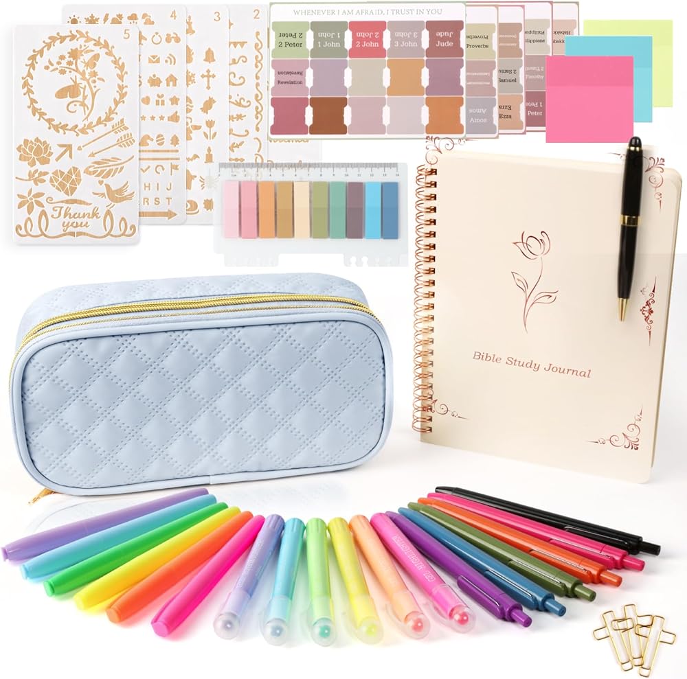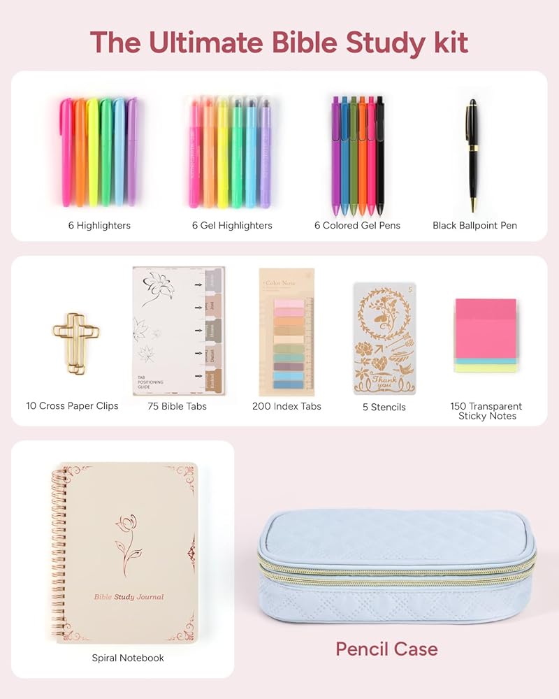 • 【مجموعة Struction study study】】 Bellahold Bible Strentation Kit مجموعة مبسطة من الأدوات لتعزيز تجربة دراستك ، بما في ذلك حالة قلم رصاص واحدة ، 6 أرقام عالية ، 6 أدوات عالية من الهلام ، 6 أقلام هلام ملونة ، قلم من نقاط الكرة السوداء ، 1 دفتر مملوء ، 5 Stencil ، 75 علامات تبويب من المقابلات مع علامات التبويب.