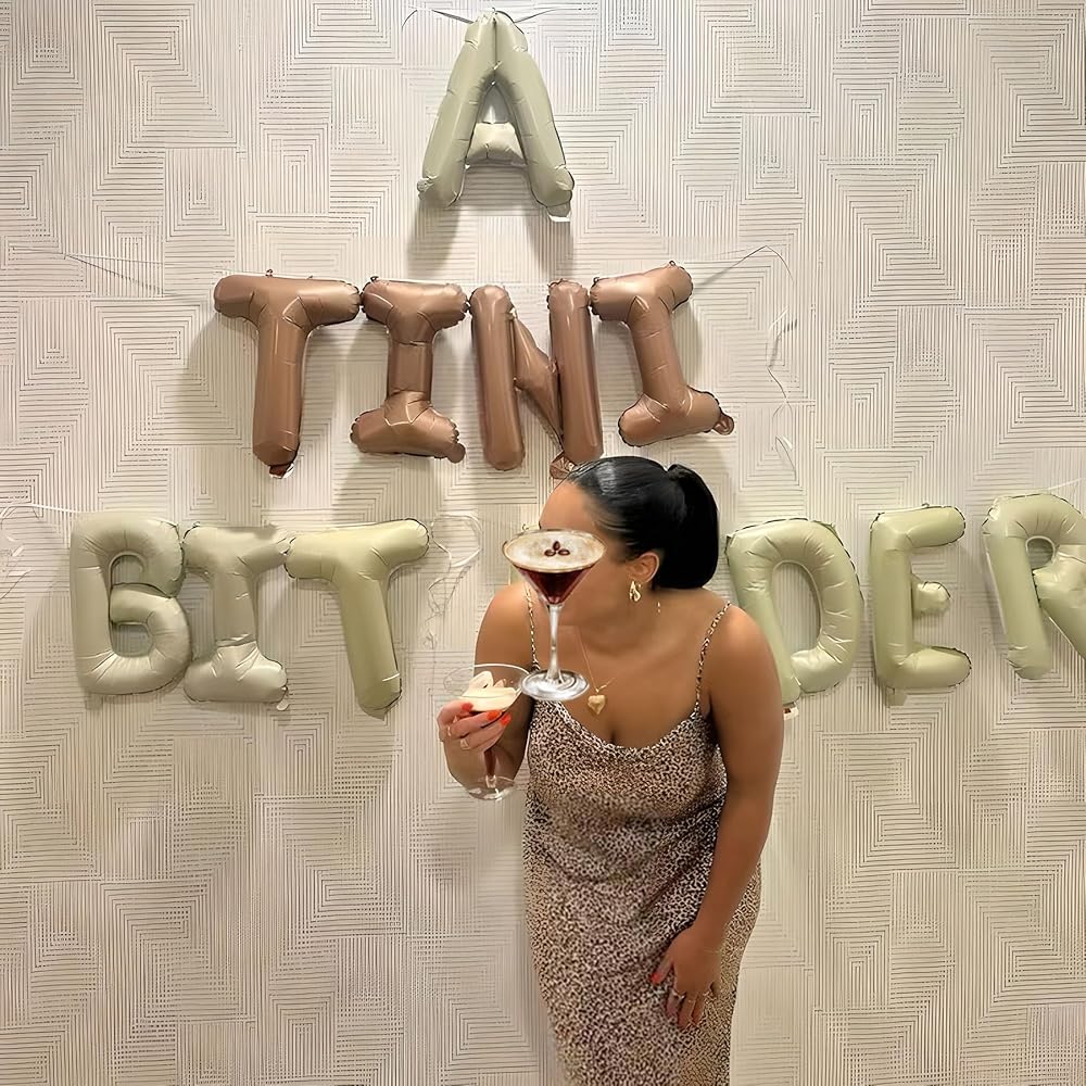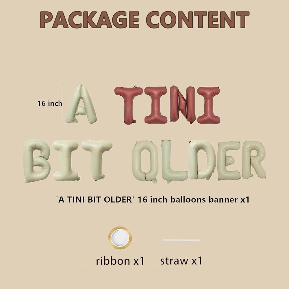 What's Include: Totally 15 Pcs " A Bit Tini Older" letter balloons with 1 pcs ribbon and 1pcs straw. Each lettr balloon measurement about 16 Inch.