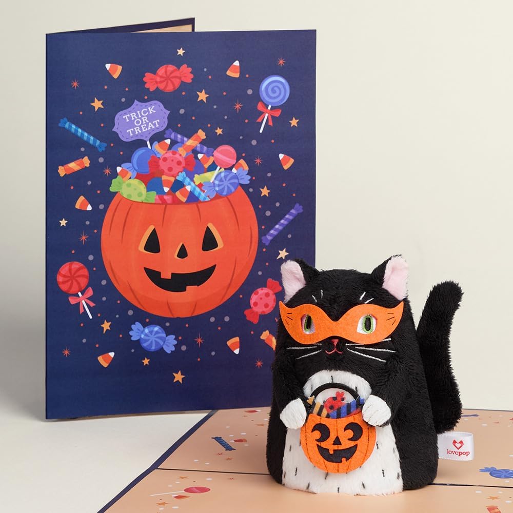 ميزة مخلوق خاص: احتفل بالهالوين مع بطاقات الحيوانات الفخمة في LovePop. يتميز غطاء البطاقة بقع اليقطين المليء بالحلويات في الداخل. تفتح البطاقة ، وكشفت عن قطة الهالوين منبثقة ثلاثية الأبعاد مصنوعة من مواد فخمة ناعمة وغامضة.