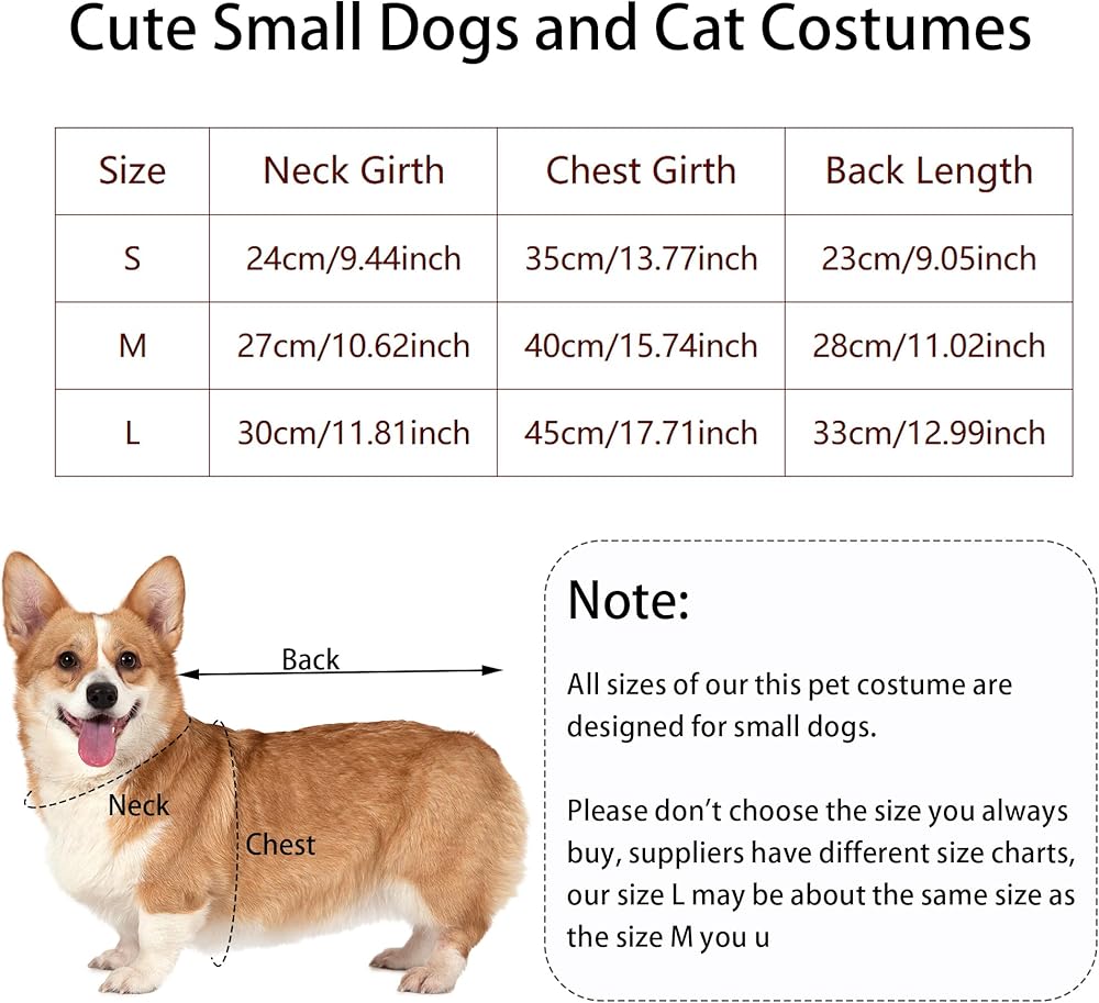Size Small: Dog easter costume for small dogs is in size Small. Back Length 9.05 in/23cm; Chest Girth 13.77 in/35cm, Neck Girth 9.44 in/24cm, suitable for most small dogs and cats