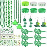 • أكمل شارع. مجموعة ملحقات Patricks Day: احتفل بروح يوم القديس باتريك مع مجموعة الملحقات الكل في واحد! تشتمل الحزمة على أقراط شامروك متلهقة للزوجين ، 6 نظارات شامروك ، 6 قلادات شامروك ، 12 أساور شامروك ، ملصقات ظلال العيون 2 صفائح و 62 ملصقات وشم نابضة بالحياة.