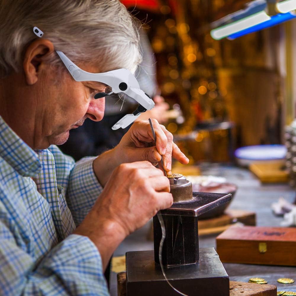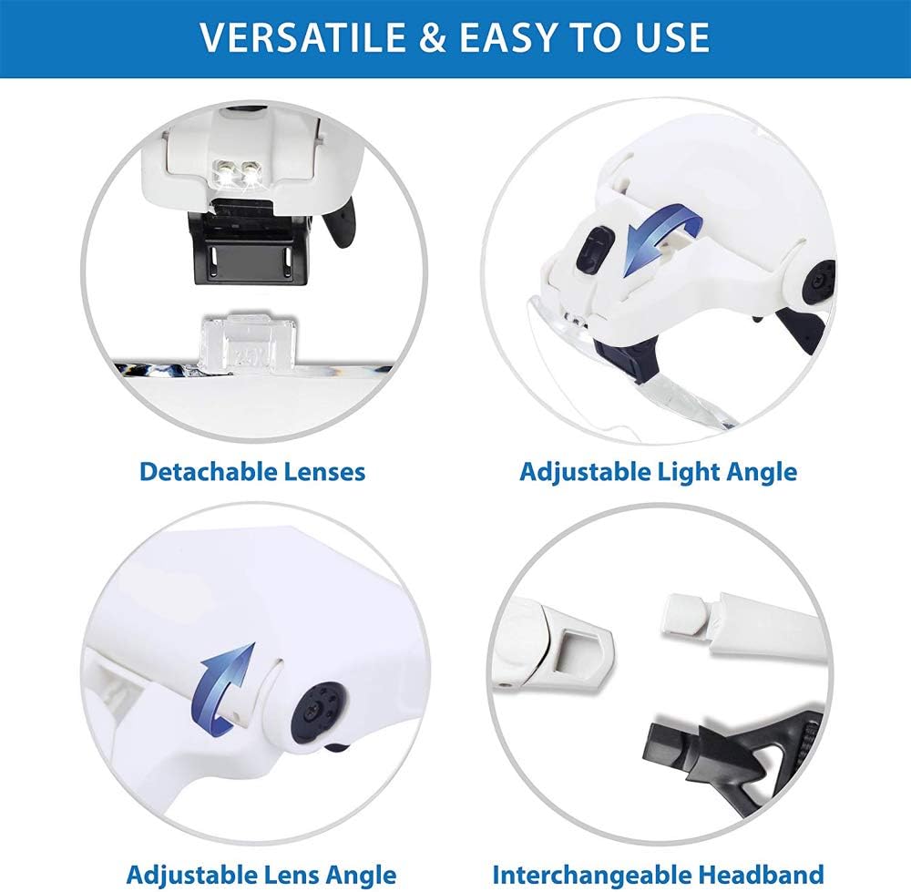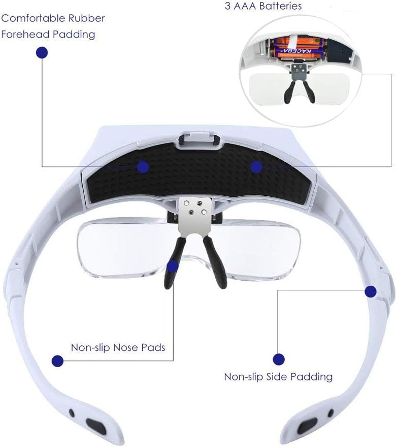 5 Different Magnification Lens Headband Magnifying Gl With 5 replaceable lenses 1.0X, 1.5X, 2.0X, 2.5X, 3.5X magnification, can meet your different requirements. Ideal hands free LED magnifiers forsts, crafts worker watchmakers, dentists, electricians, modelers, hobbyis, magnifier glass for close work.