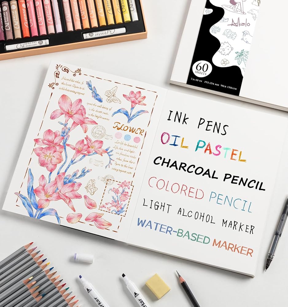 【ورقة خالية من الأحماض وغير المحببة】 يستخدم كراسة الرسم لدينا ورقة خالية من الأحماض لحماية أعمالك الرسم من تلاشي الألوان. مناسبة لعلامات الكحول ، وعلامات الأكريليك ، وأقلام الفحم ، وأقلام الحبر ، وأقلام الرصاص الملونة ، والباستيل الزيتية.