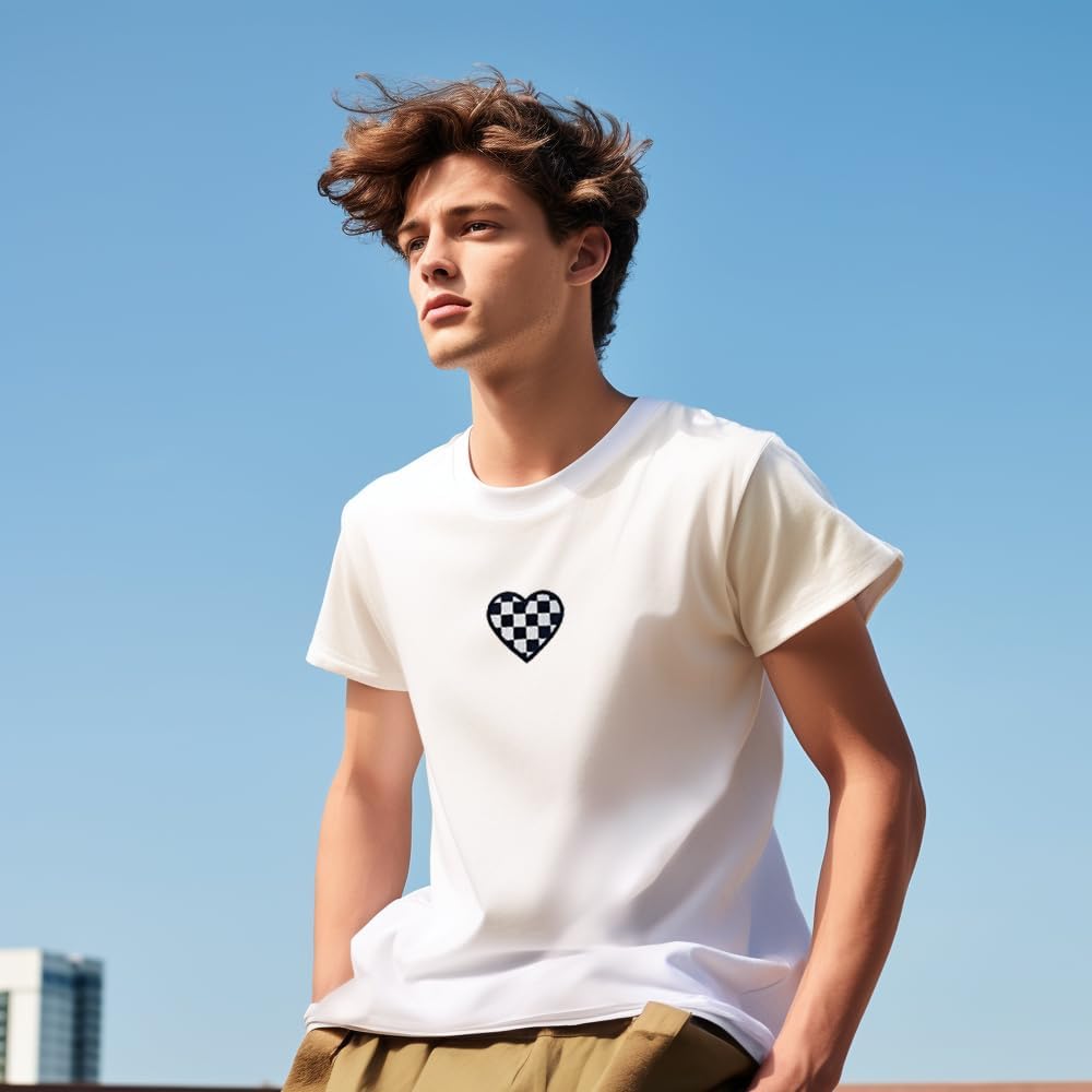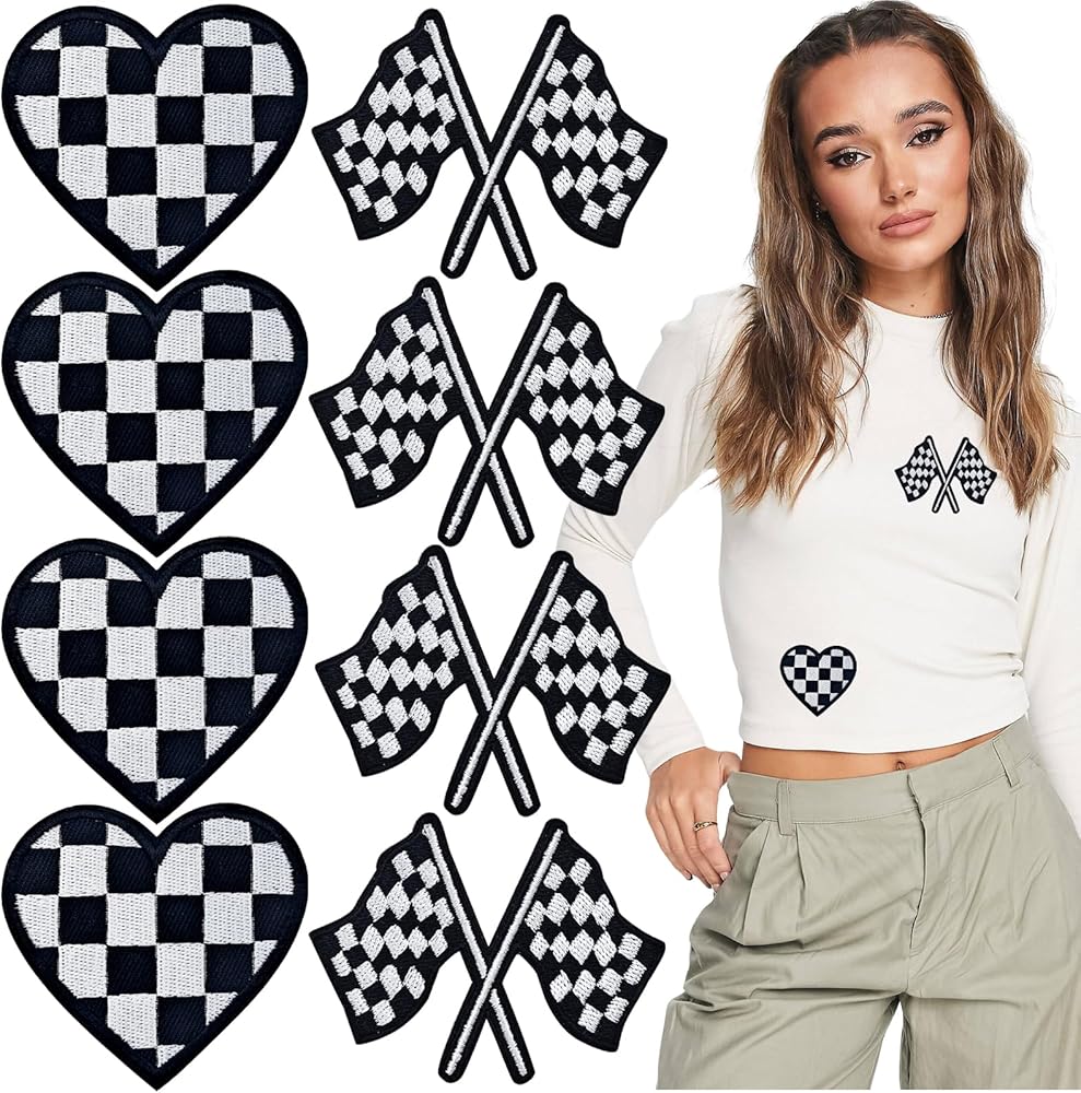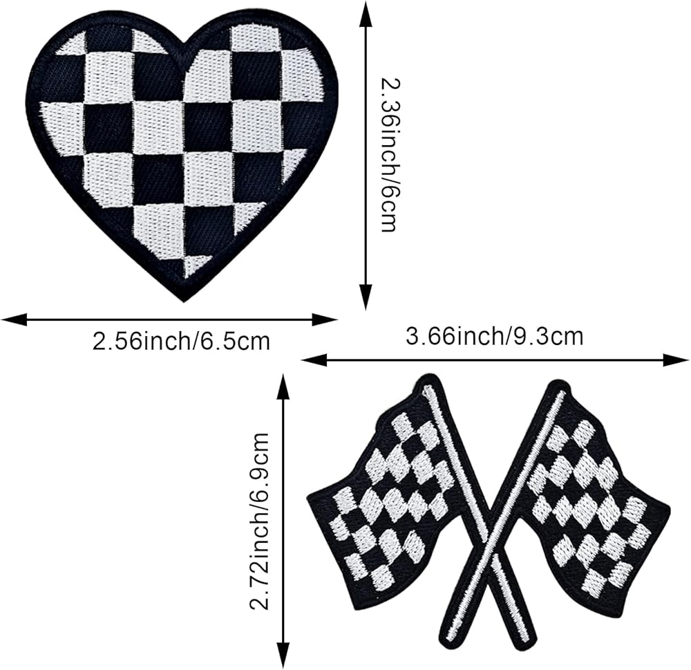 10 PCS Checkered Racing Flag Patches, Heart Checkered Iron On Patches, Black White Hearts Embroidered Jean Patches Punk Funny Embroidered Badge Iron for Clothes Bags Hats T-Shirts Jeans