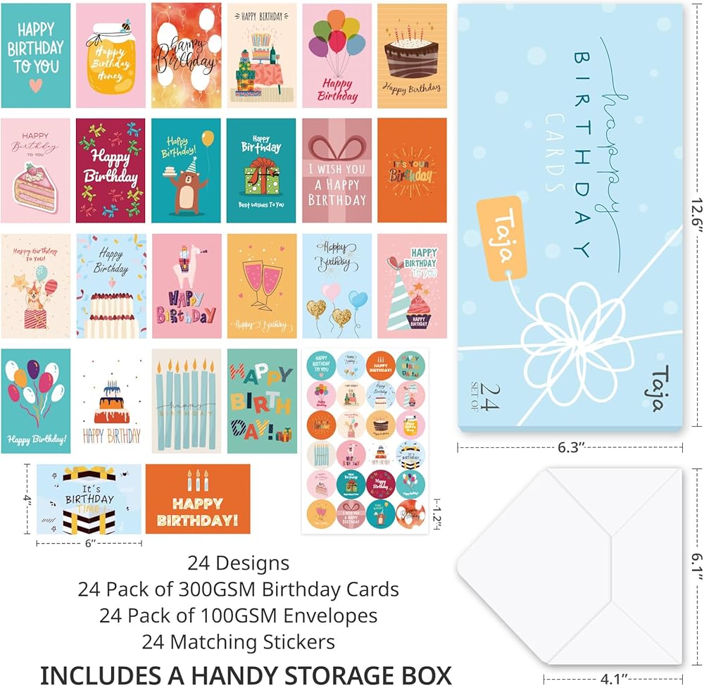 حزمة الراحة الشاملة: توفر بطاقات عيد ميلادنا السائبة مجموعة من بطاقات 24 × 6 بوصة ، والتي تكملها 24 مظاريف بيضاء تضم أختام لاصقة ، و 24 ملصقًا تنسيقًا. مغلف في صندوق تخزين قوي ، يتم ترتيب المجموعة بأكملها وترتيبها بدقة للعرض التقديمي. تعد هذه الحزمة الشاملة بمثابة حل مثالي وشاق لنقل رغباتك القلبية للأصدقاء وأفراد الأسرة والزملاء على حد سواء.