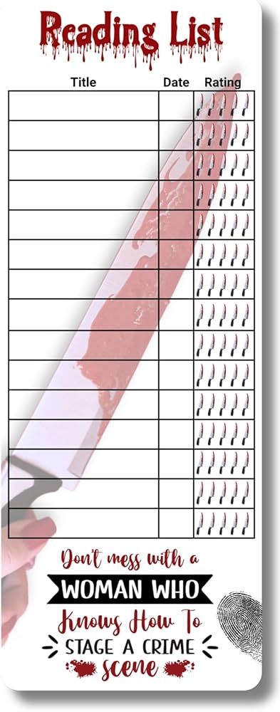 Unique Design: Set of 10 true crime themed book tracker bookmarks featuring a bloody handprint and gritty graphics.