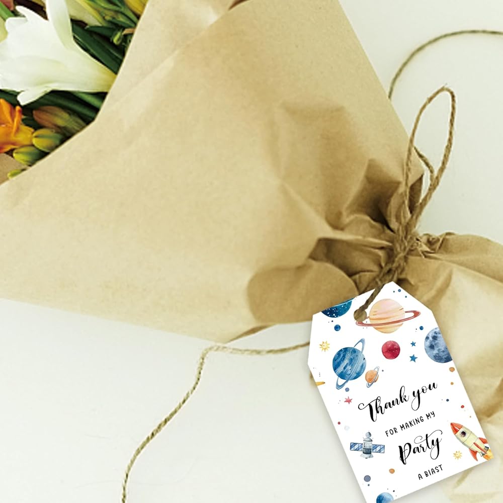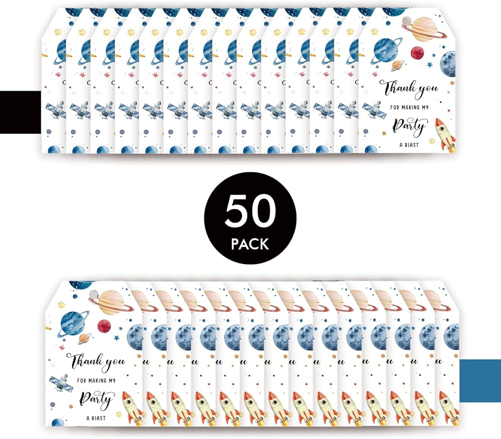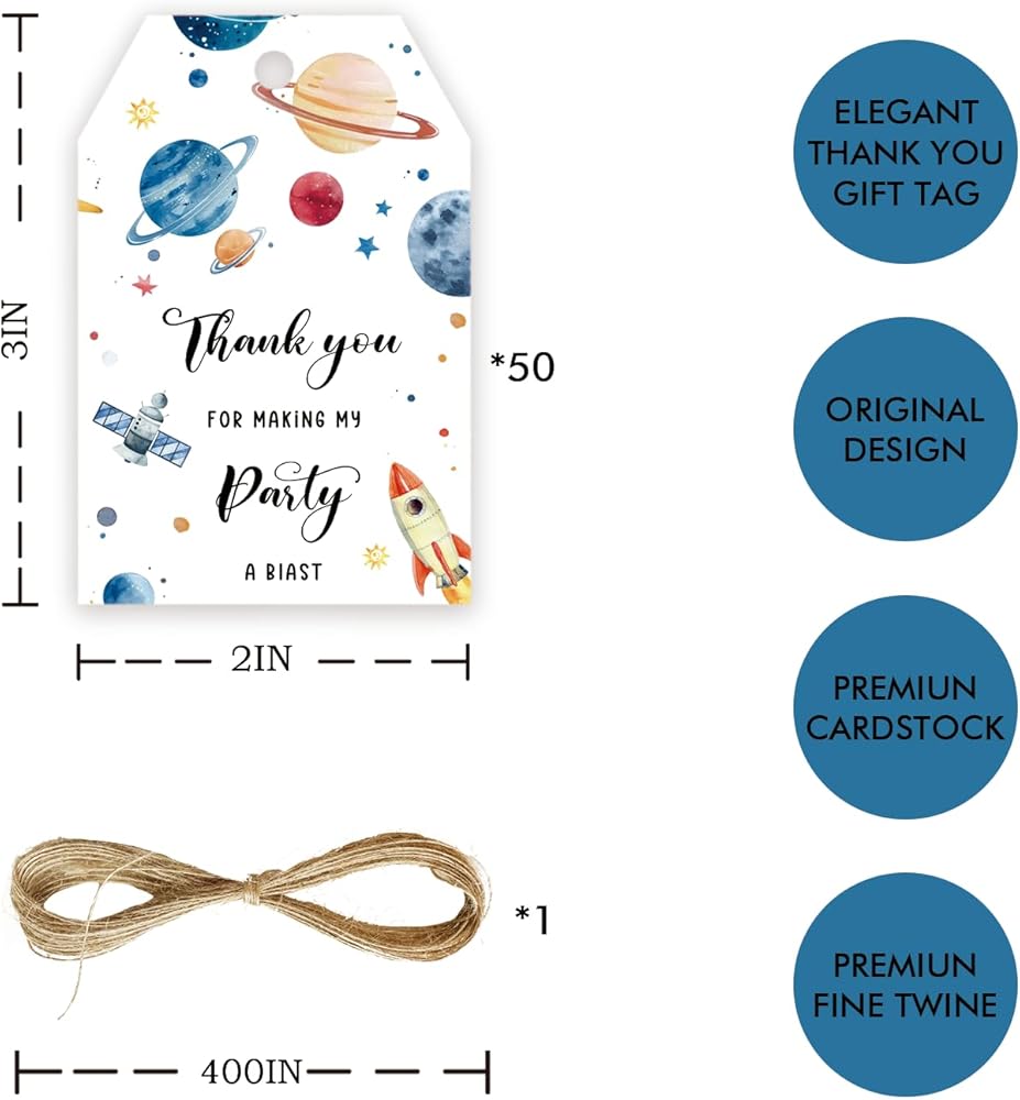 WHAT YOU WILL GET ? 🚀 - 50 pack of DOUBLE sided Outer Space thank you tags with hole what digitally printed on card stock that comes pre-cut. Exquisite patterns printed on both sides. Each tag is approximately 2 inches and 3 inches long. A 393 inches long fine twine must also be included.