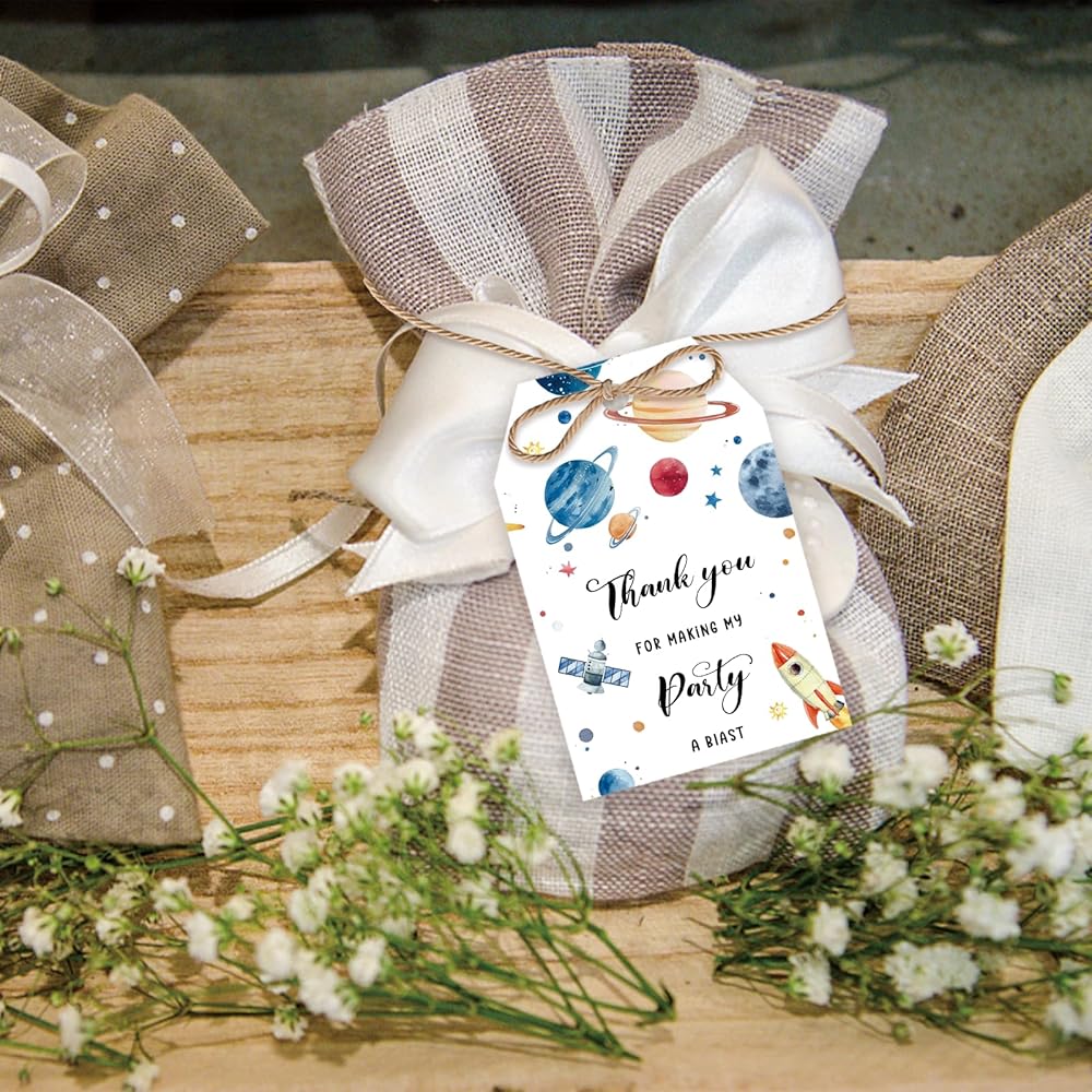 PERFECT GIFT TAGS FOR ANY PARTY 🚀:Add more cuteness to your gifts or dessert with this beautiful gift tags for your outer space themed party, boys birthday party, space themed party, anniversary party, space planet themed party and so on.