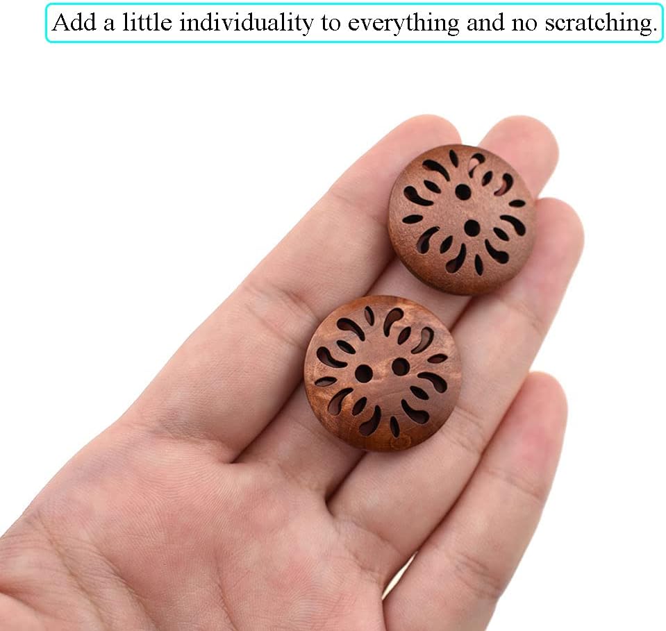 Bigger needling holes:You will like that the buttons have large holes with no wood splinters,so you don't have to use a really fine-sized needle in that case.They are easy to sew on even with a thicker needle.The rather large holes also gives you more room to use embroidery thread to add even more color and texture.