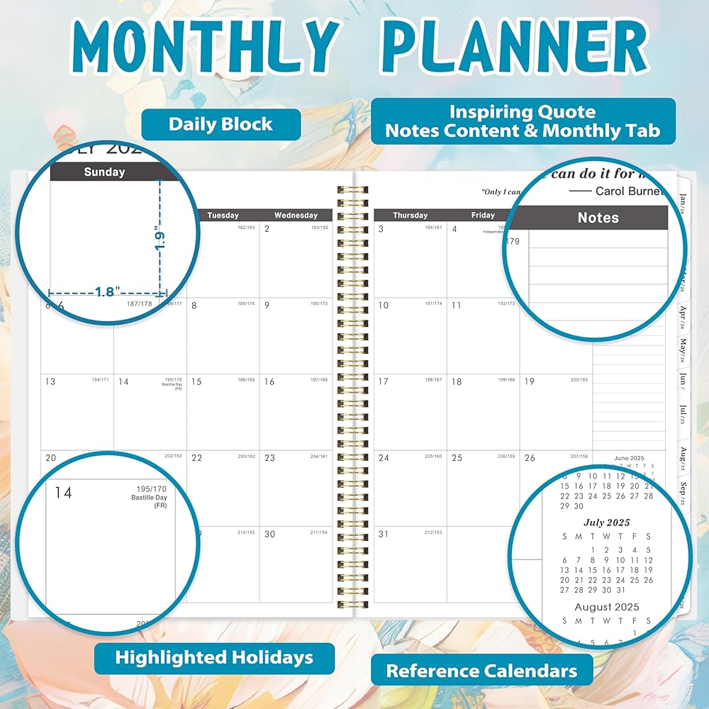 • نظرة عامة شهرية - مخطط شهري 2025-2027 لا ترتبط بخطوط أفقية ، بحيث يمكنك الكتابة بحرية ، ويحتوي كل يوم على مساحة كتابة 1.18 "× 1.26" لتسجيل خطتك اليومية. على الجانب الأيمن ، يوجد أيضًا قسم ملاحظات ، حيث يمكنك تسجيل النقاط الرئيسية لجعل خطتك أكثر تنظيماً
