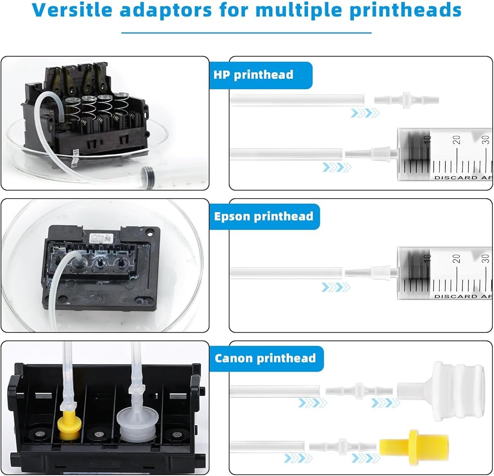Versitle والمحولات الشاملة: تشتمل مجموعة تنظيف الطابعات الخاصة بنا على مجموعة من المحولات متعددة الاستخدامات والشاملة ، مما يجعلها متوافقة مع مختلف العلامات التجارية لرأس طباعة الحبر مثل Epson و Canon و HP وما إلى ذلك.
