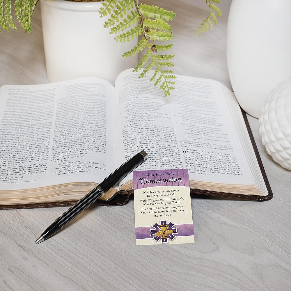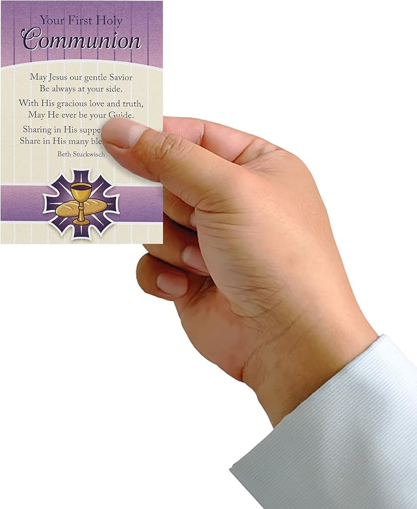 Comes as a matching pack of 24; Charming bookmark features sentiment reading "Your First Holy Communion; May Jesus our gentle Savior be always at your side. With His gracious love and truth, may He ever be your guide. Sharing in His supper, may you share in His many blessings too". Book placeholder is made of a durable cardstock material with purple finish. Bookmark measures approximately 3 x 2 inches; To, From spaces on the back make for a wonderful gift. Never lose the spot in your favorite book and be encouraged with each sentiment. Contained in protective packaging; Ready for gifting.