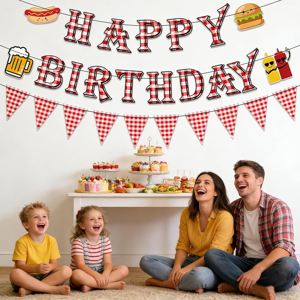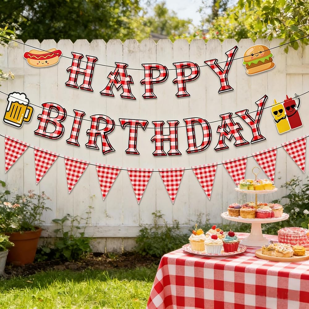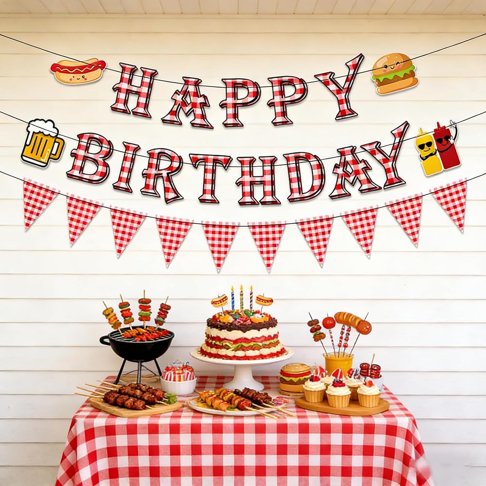 Package: you will receive 1pc HAPPY BIRTHDAY banner, 1pc red white and pink checkered banner, 8pcs hanging swirls with spirals, 4pcs balloons included 1 hamburger, 1ketchup, 1 mustard and 1 hot dog shaped balloons