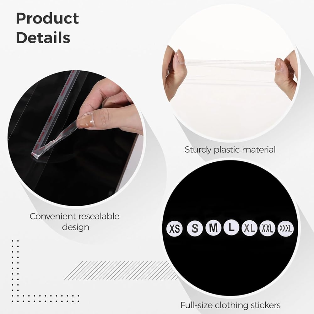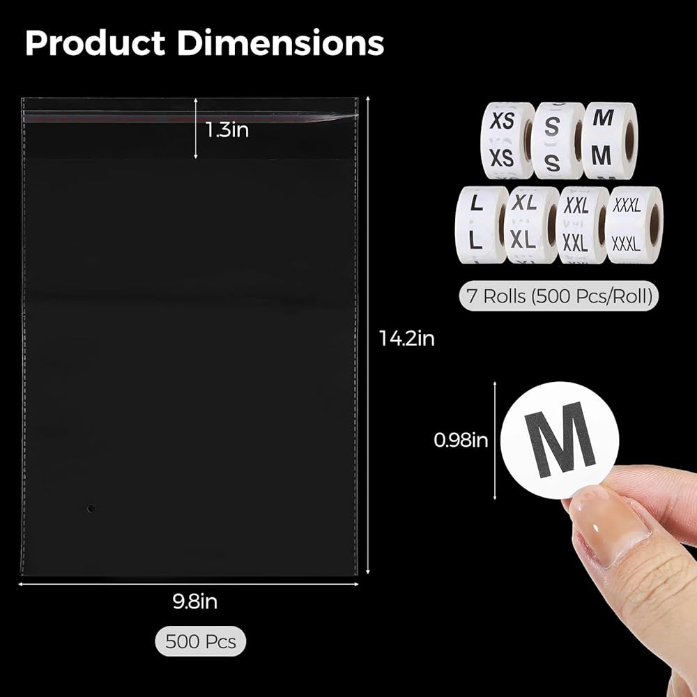 كمية وافرة ذات الحجم المناسب: تتضمن هذه المجموعة 500 أكياس بلاستيكية شفافة قابلة لإعادة الاستغناء عنها و 7 لفات من ملصقات ملصقات الملابس بأحجام 7 ، تلبي جميع احتياجات التغليف والاستبدال. الأكياس قياس 14.2 × 9.8 "وملصقات الملصقات هي 0.98 × 0.98" ، وهي مثالية لتعبئة عناصر الملابس الصغيرة المختلفة