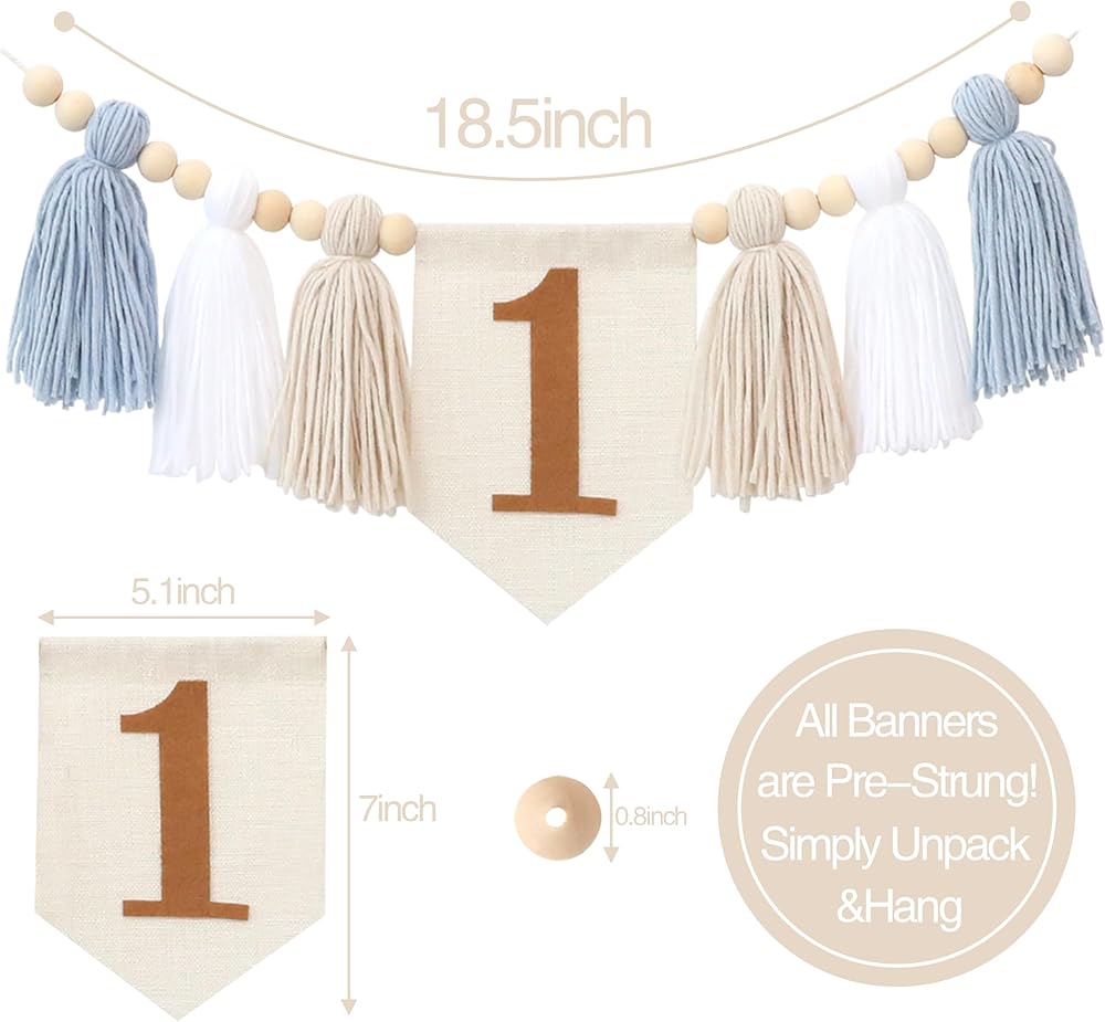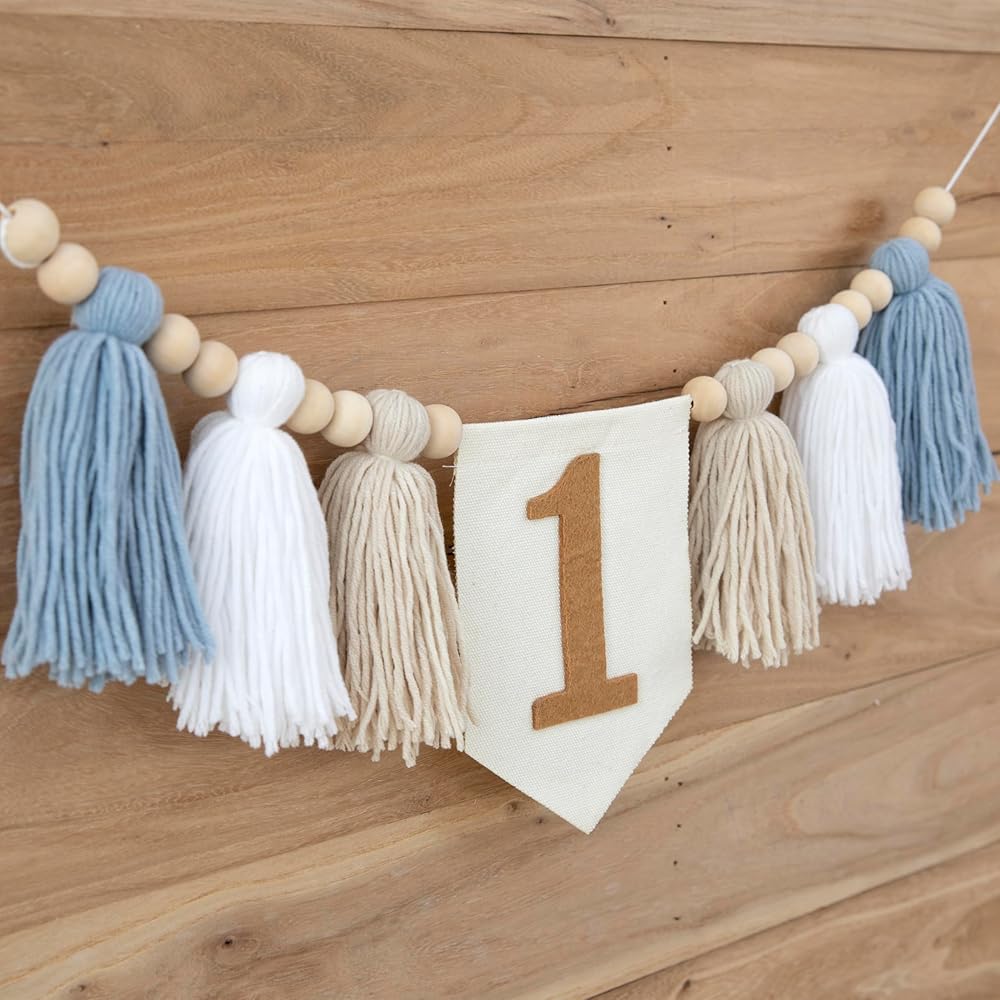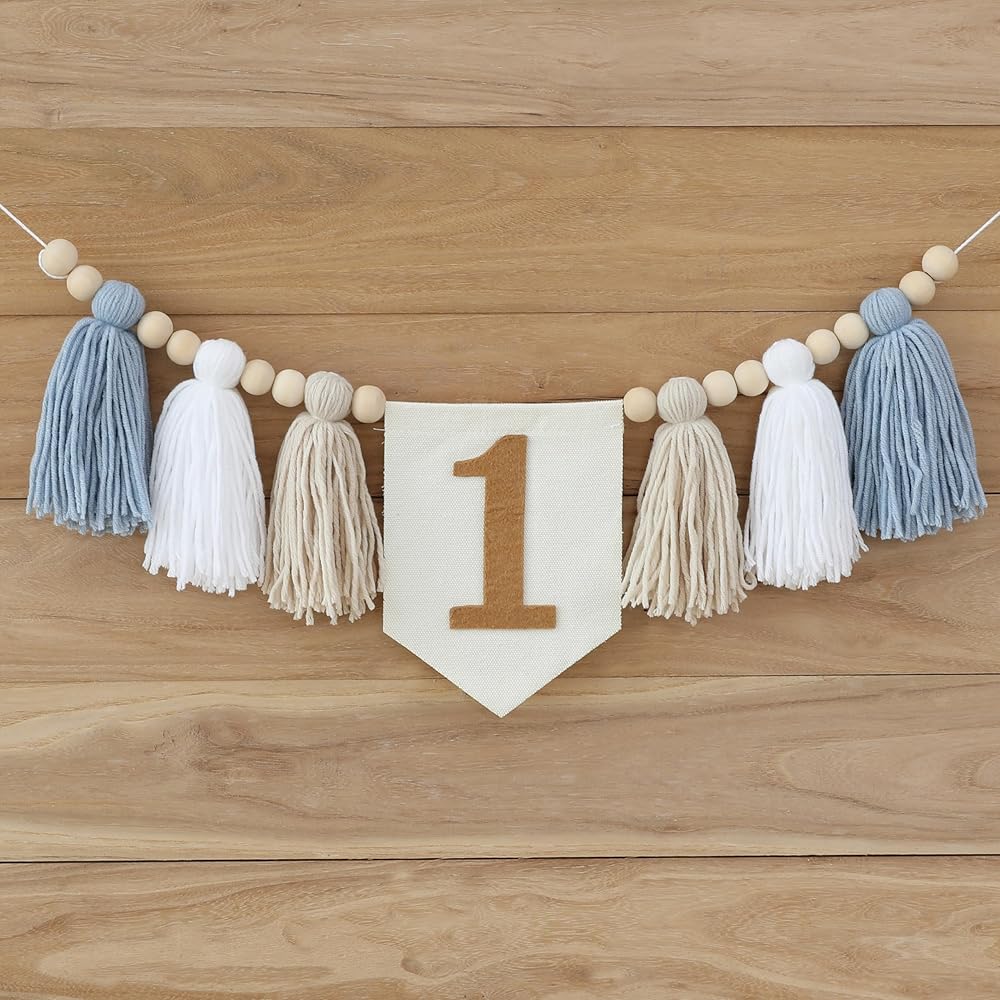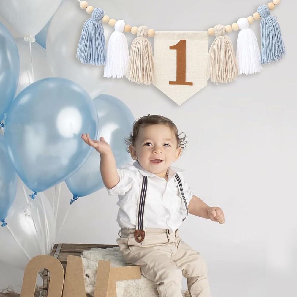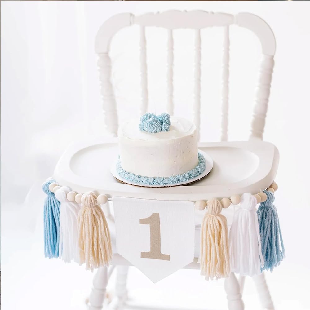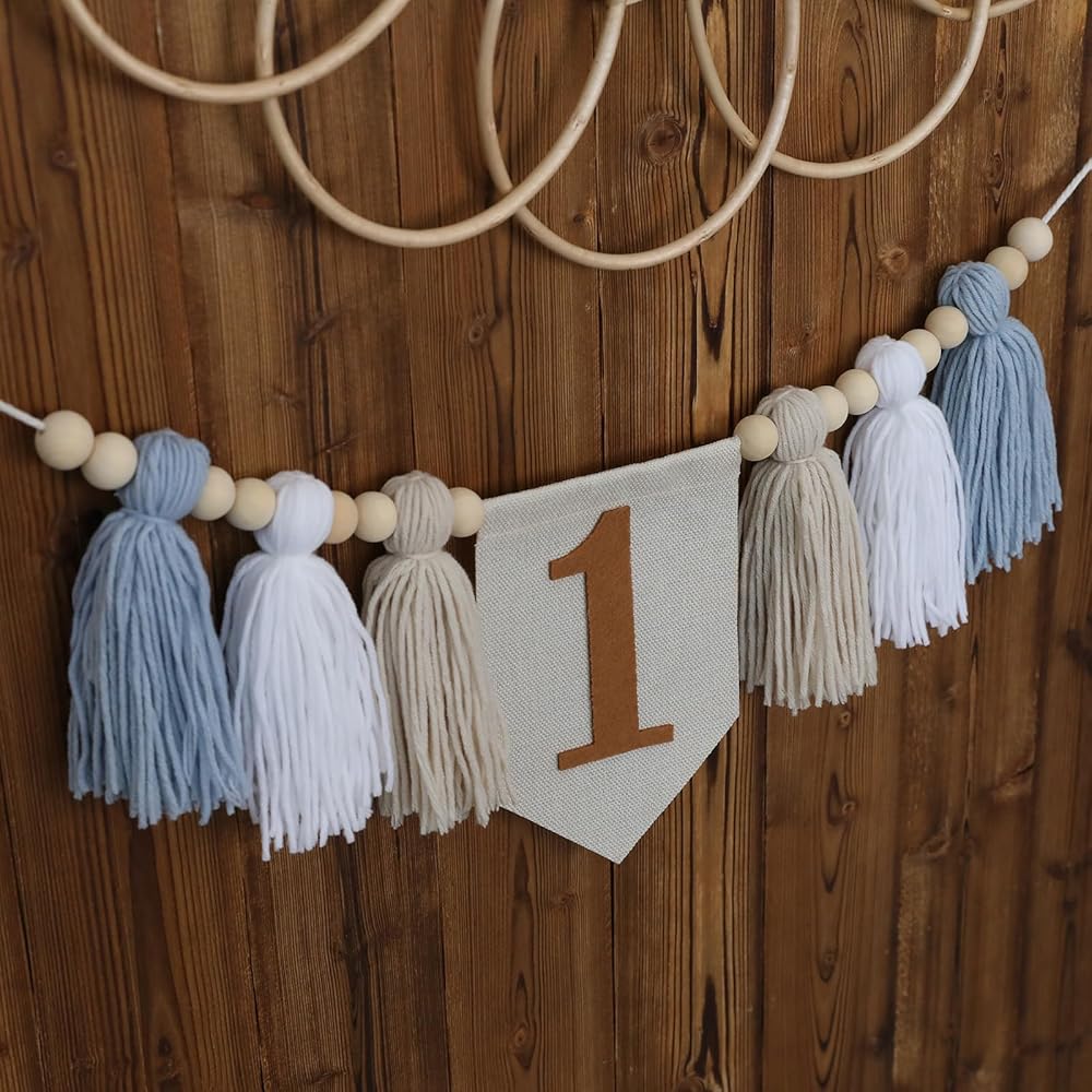 مصنوعة يدويًا بوهو الأول عيد ميلاد عالي كرسي زخرفة حفلة للفتاة للفتاة استحمام الأزرق والأبيض جدار شنقا تزيين للأطفال