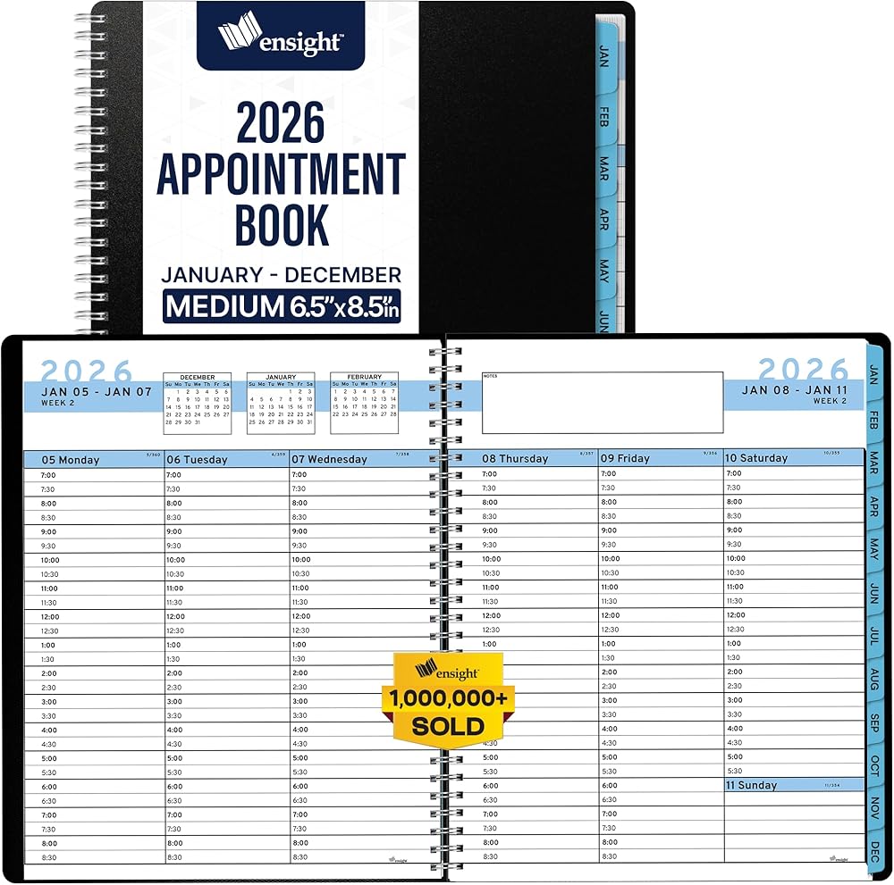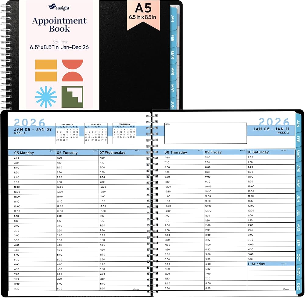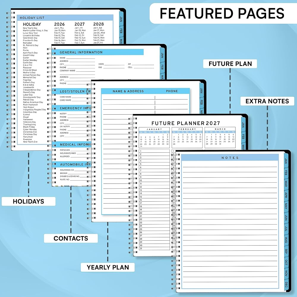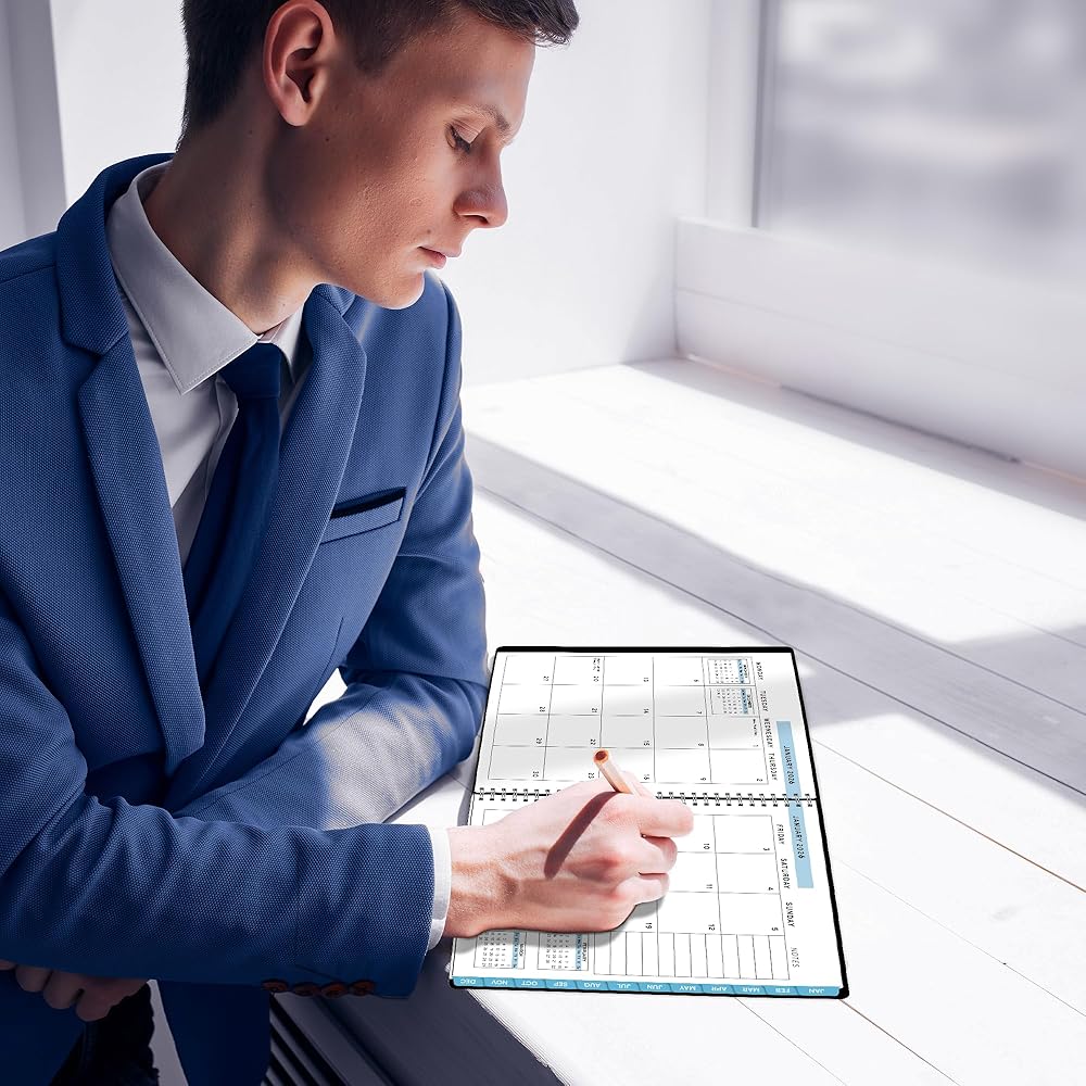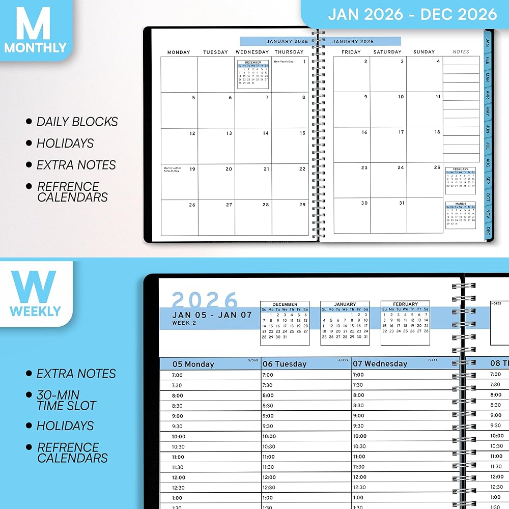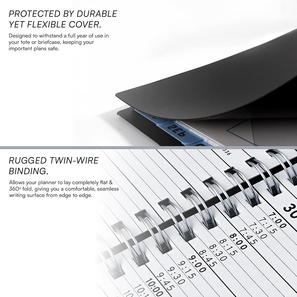 𝗦𝗢𝗙𝗧 𝗖𝗢𝗩𝗘𝗥 & 𝗧𝗪𝗜𝗡 𝗪𝗜𝗥𝗘 𝗪𝗜𝗥𝗘: يبدأ الأسبوع الاثنين وينتهي يوم الأحد باستخدام 2025 Weekly Planner 8.5 × 11. تم تصنيعه مع غطاء PVC أسود ذو جودة عالية مع ملزمة قوية مزدوجة للمنع.