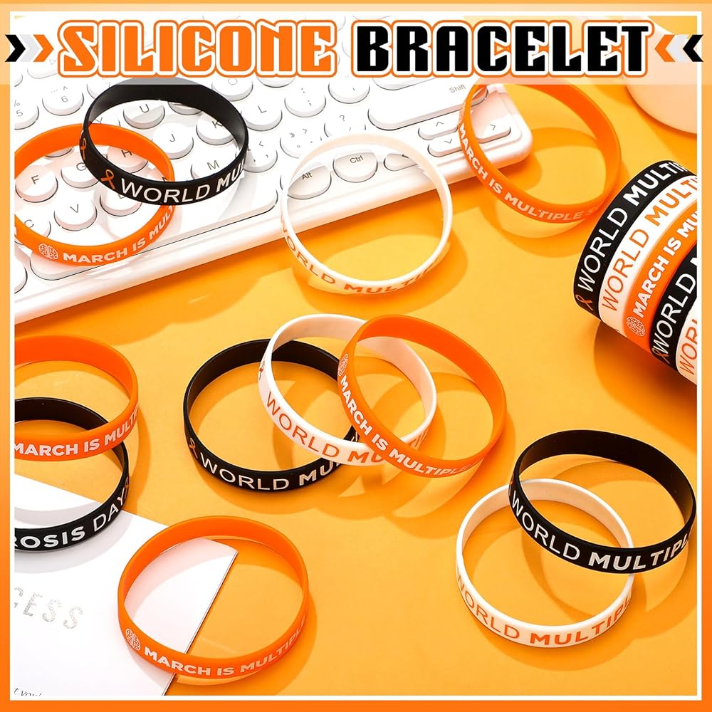 These multiple sclerosis awareness rubber bracelets are brightly colored and clearly patterned, not only suitable for the festive but for everyday wear as well. Their resilience allows them to withstand everyday wear and tear, making them last longer while retaining their vibrant designs