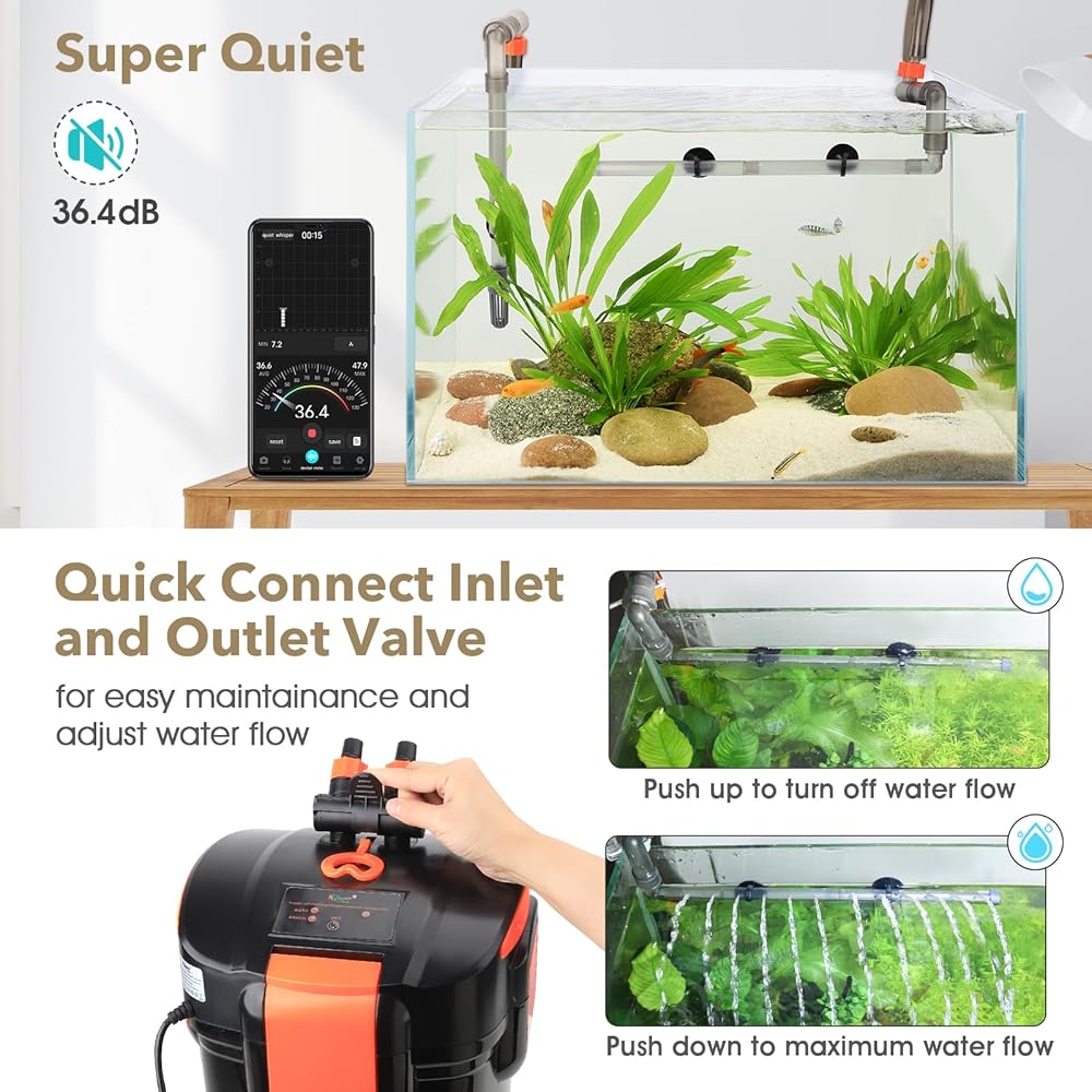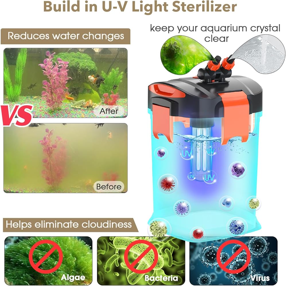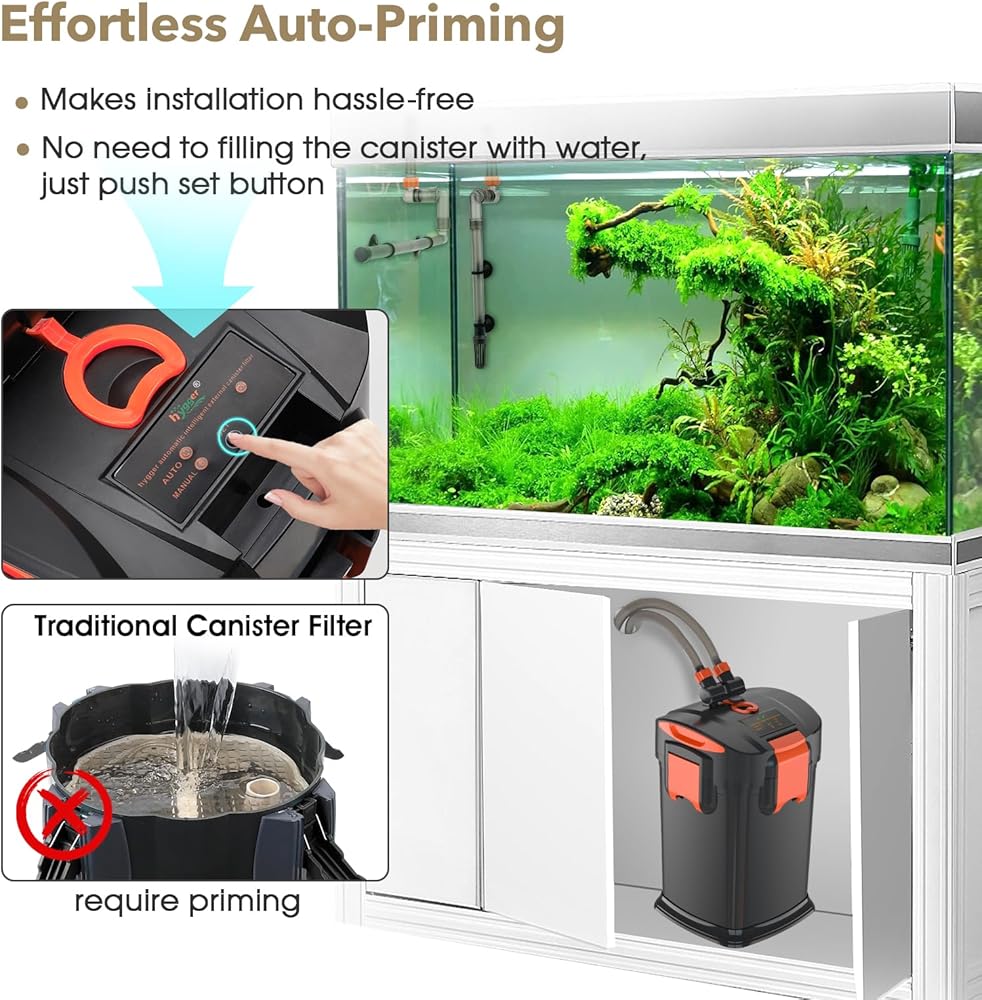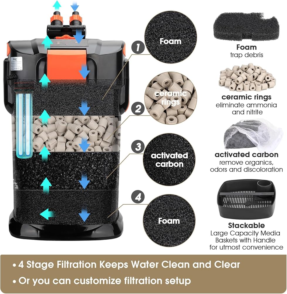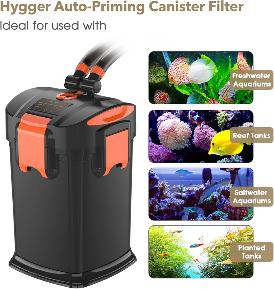 Hygger Head Self-Primping Canister Filter مع حلقات سيراميك الكربون المنشط من الرغوة الفاتحة U-V ، مرشح خزان أسماك خارجي قابل للتعديل من 80 إلى 180 جالونًا في المياه العذبة المملحة 581 GPH