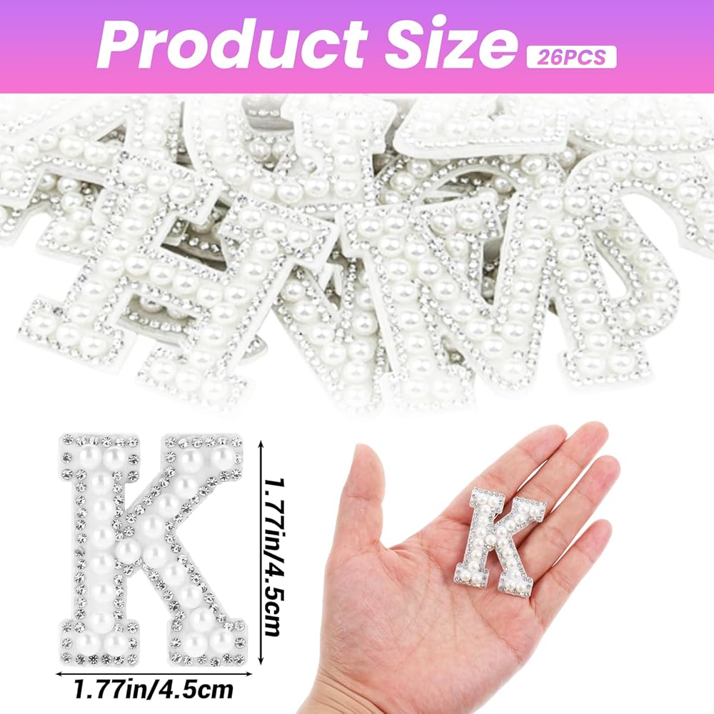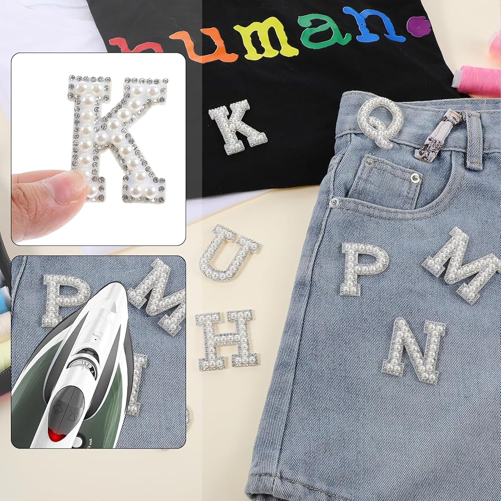 Qianyu 26 Pcs Pearl Rhinestone Letter Patches Iron On Self Adhesive Stick on Pearl Letter Word Applique Decorative Repair Patches for Clothes Fabric DIY Backpack Hat Decoration Craft Supplies