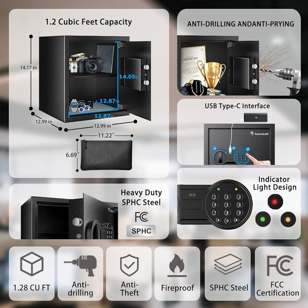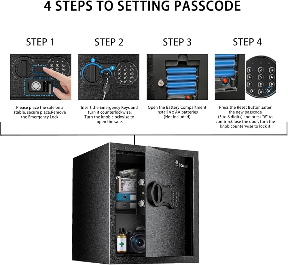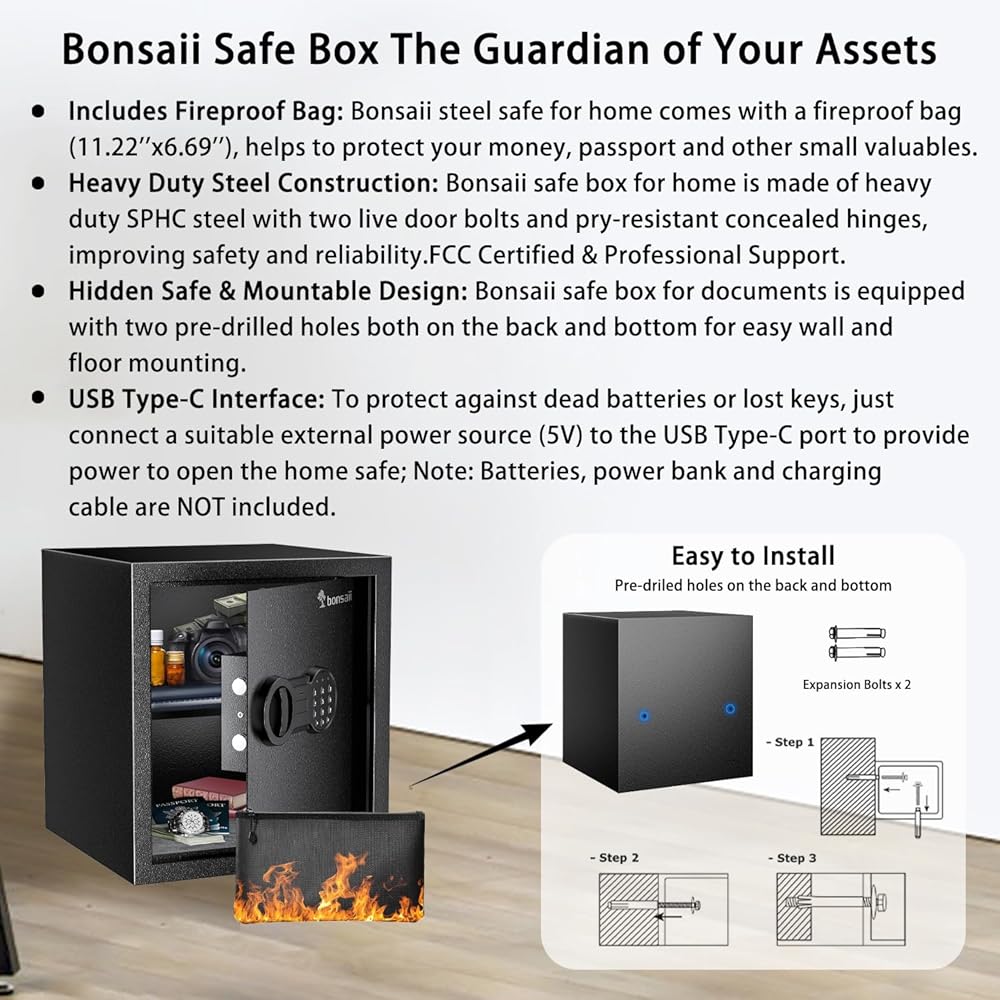 FCC Certified & Expert Support: The Bonsaii security safe box is backed by professional customer service. The package includes: 1 x Bonsaii Safe Box, 2 x Emergency Keys, 2 x Expansion Bolts, 1 x Money Bag, 1 x Removable Shelf, 1 x Floor Mat, 1 x User Manual.