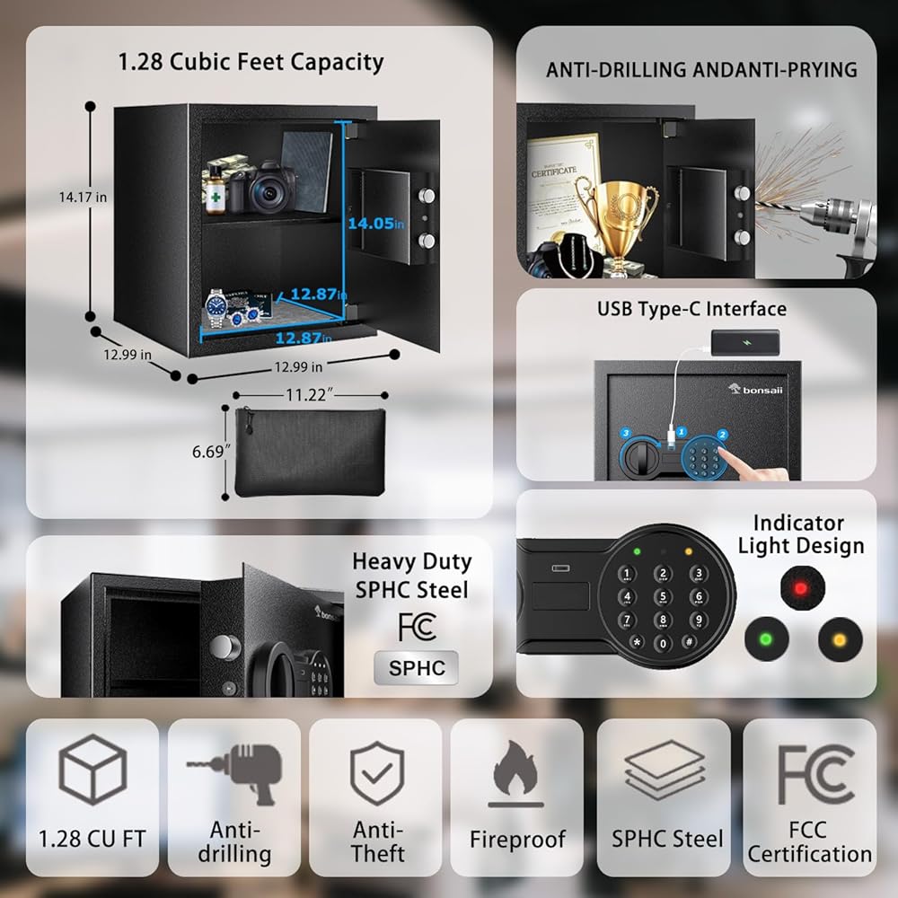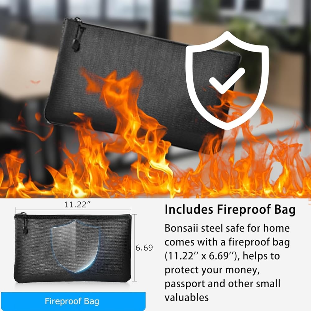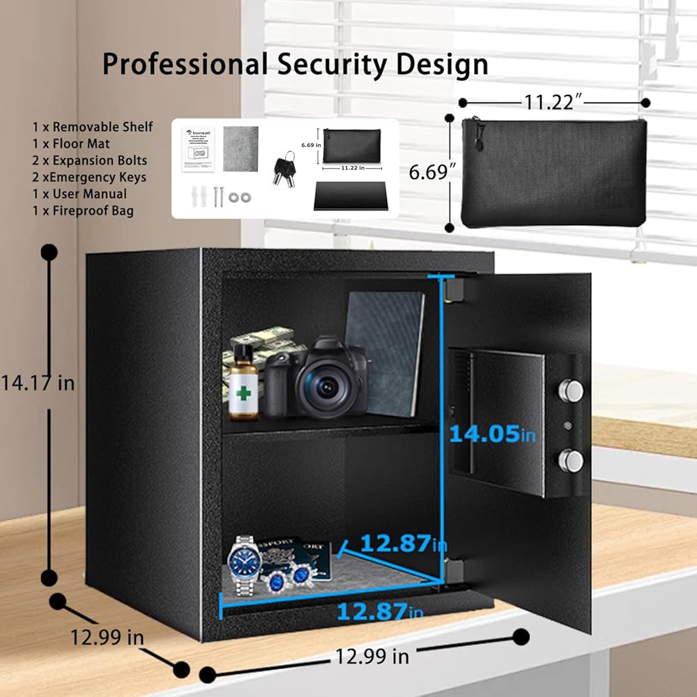 Compact Design: Exterior: 12.99 x 12.99 x 14.17 inches (D x W x H); Interior: 12.87 x 12.87 x 14.05 inches (D x W x H); Fireproof bag: 11.22 x 6.69 inches. Bonsaii safe box can be easily hidden into wardrobes, shelves and drawers.