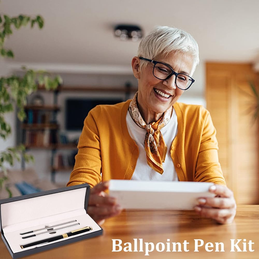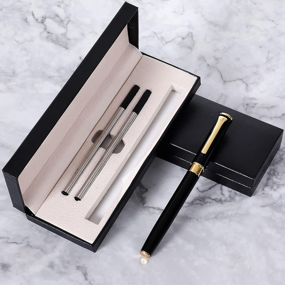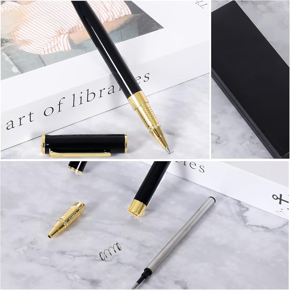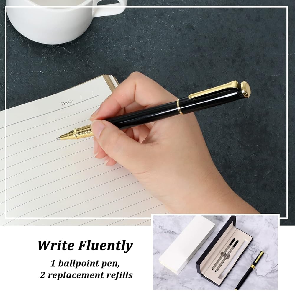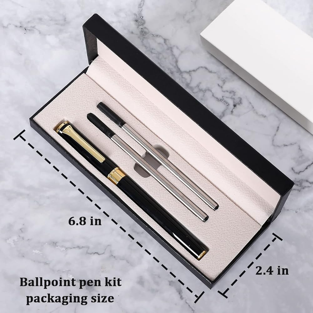 【تم تعبئة قلم قلم نقاط Ballpoint】 قلم حبر الأسود والذهبي واثنين من عمليات إعادة التعبئة البديلة في صندوق هدايا أسود فليب ، فاخر أنيق. يبلغ طول قلم نقطة العمل 5.3 بوصة وإعادة الملء 4.4 بوصة.