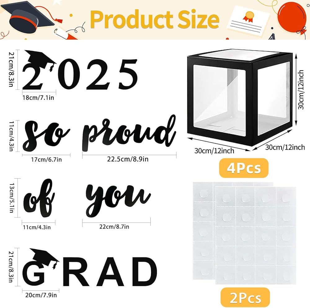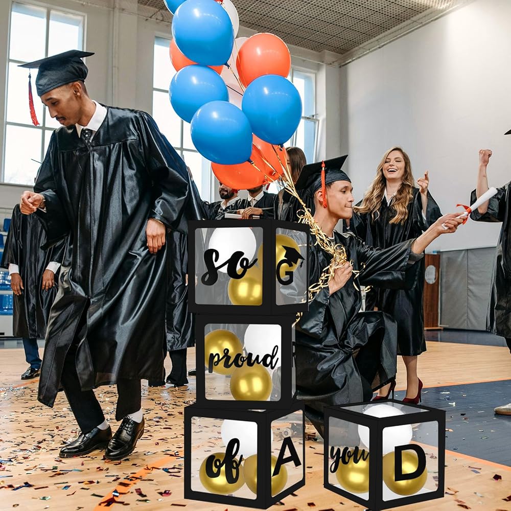 حزمة من 4-12x12x12 بوصة صناديق بالون سوداء واضحة مع خطابات 'خريج وفخور جدا بك' لزخارف حفلة التخرج لا تنسى 2025 باب المنزل الداخلي في الهواء الطلق