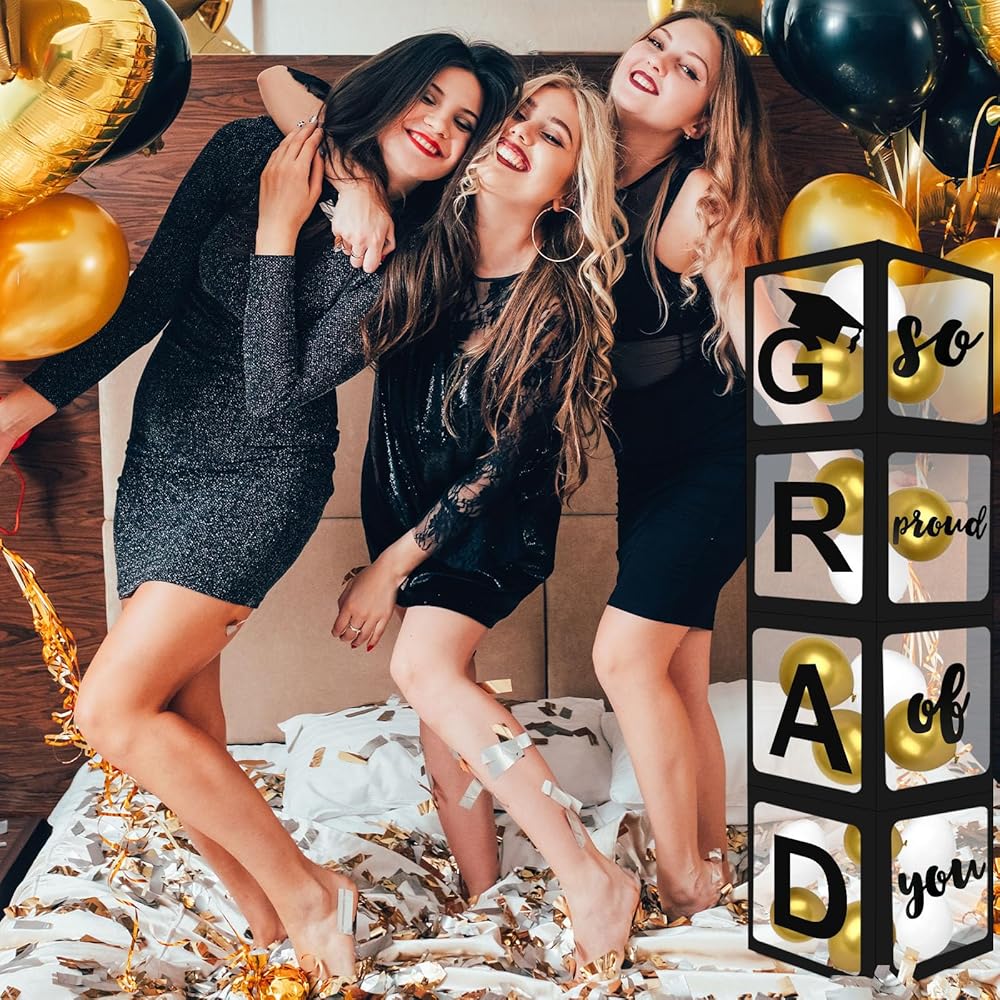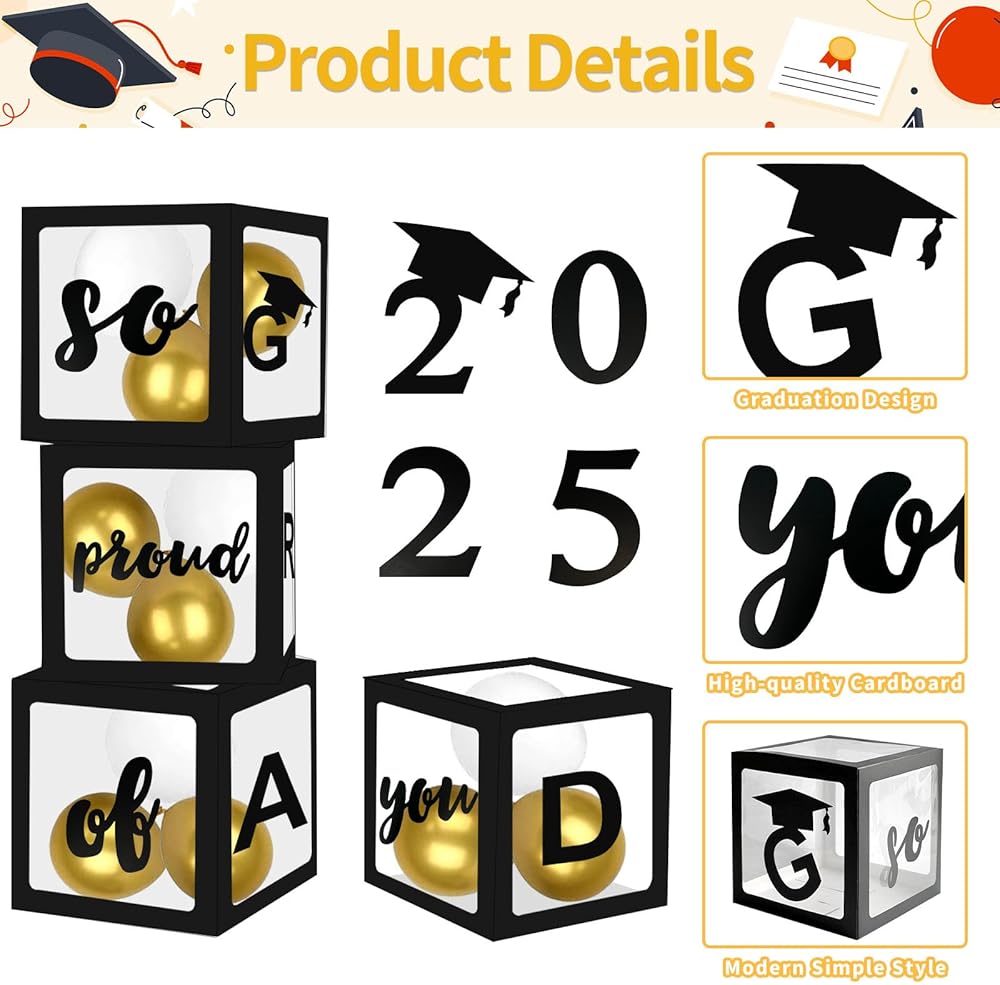 • مثالي لصور التخرج: أبعد من إضافة لمسة احتفالية إلى حفلتك ، فإن هذه الصناديق تعمل أيضًا كإعداد رائع لالتقاط الصور. قم بترتيبها للحصول على بقعة صور ممتعة وجذابة حيث يمكن للخريجين التقاط الصور مع العائلة والأصدقاء ، مما يجعل يوم التخرج أكثر خصوصية.