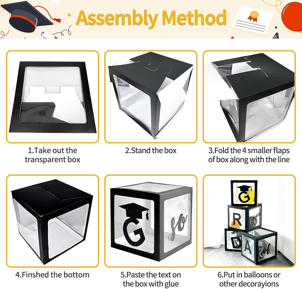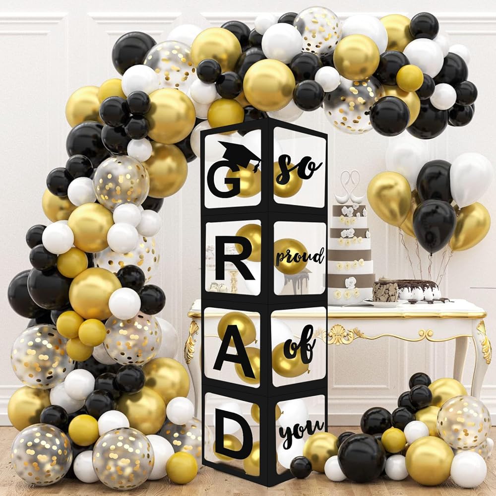 • املأ بأي بالونات: يمكن ملء الأقسام الواضحة من كل صندوق بأي بالونات تختارها. يتيح لك ذلك مطابقة ألوان مدرستك أو اختيار مزيج يحب الخريج ، مع إعطاء لمسة فريدة لزخارف الحفلات الخاصة بك.