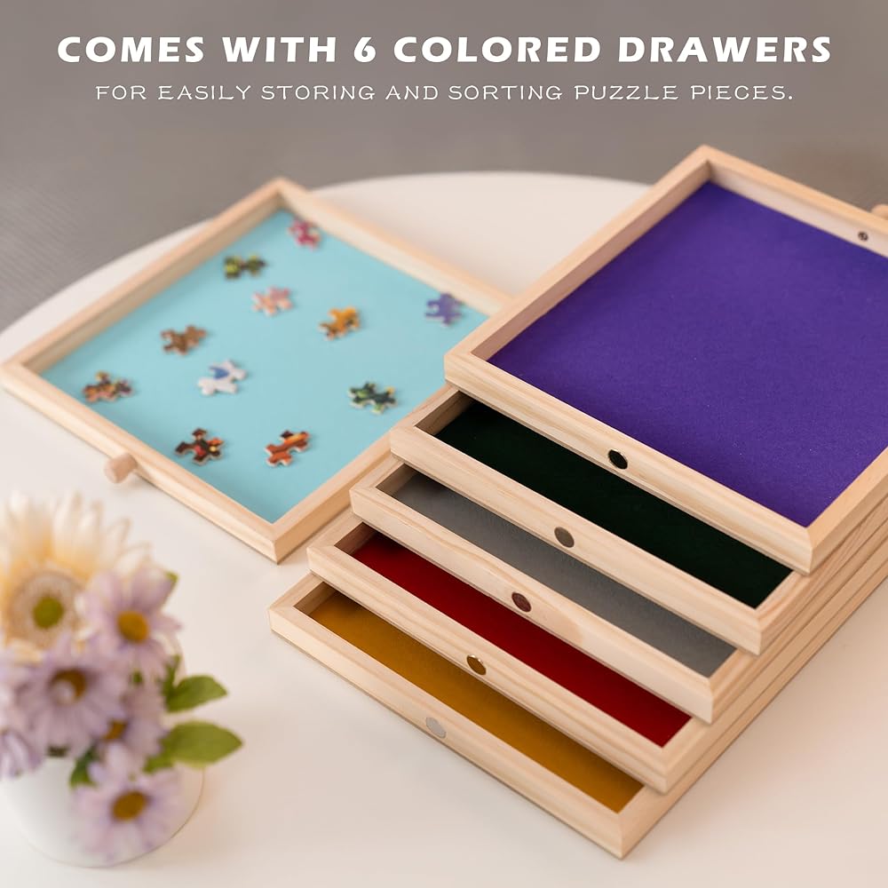 • 6 أدراج ملونة وعجلات 4 - مصممة مع 6 أدراج لفرز قطع اللغز بسهولة حسب اللون أو النمط أو الشكل ، يضمن لك منتجنا كفاءة أعلى في اللعبة. يوفر الرف السفلي مساحة تخزين إضافية لصناديق الألغاز وغيرها من الملحقات ، في حين تتيح لك 4 عجلات عالمية نقل الجدول في أي مكان تريده وضمان الاستقرار والثقة أثناء الحاجة.