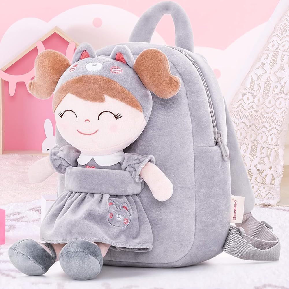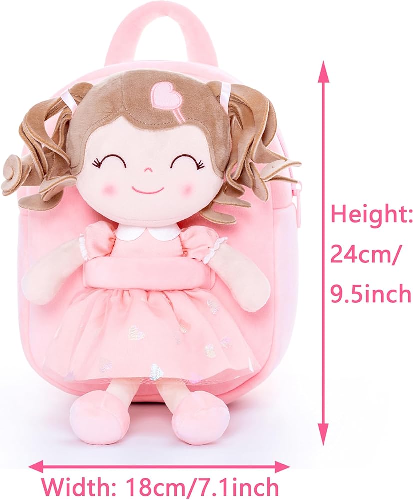 Gloveleya هدايا العودة إلى المدرسة للفتيات الصغيرات على ظهره هدية للفتيات الصغيرات حقيبة حفاضات من القطيفة مع دمية ربيعية فتاة شعر مجعد ألعاب مع حب أصفر 22.86 سم