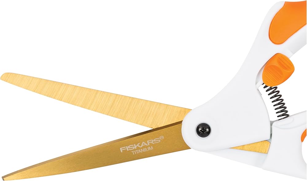 Perfect for tight, precise cuts, Fiskars Titanium Micro-Tip Easy Action Scissors feature high-grade, stainless steel blades with a nimble Micro-Tip point for unmatched control when cutting intricate details and patterns. These scissors feature a spring-action design that automatically opens the blades after every cut to help prevent hand fatigue. Blades are enhanced with a titanium coating that is 3X harder than steel for superior durability and lasting value. Additionally, a SoftGrip handle offers a more comfortable grip and improved control.