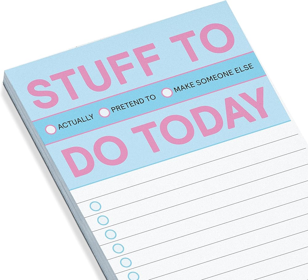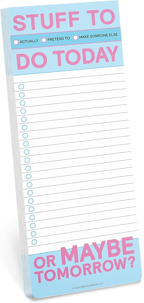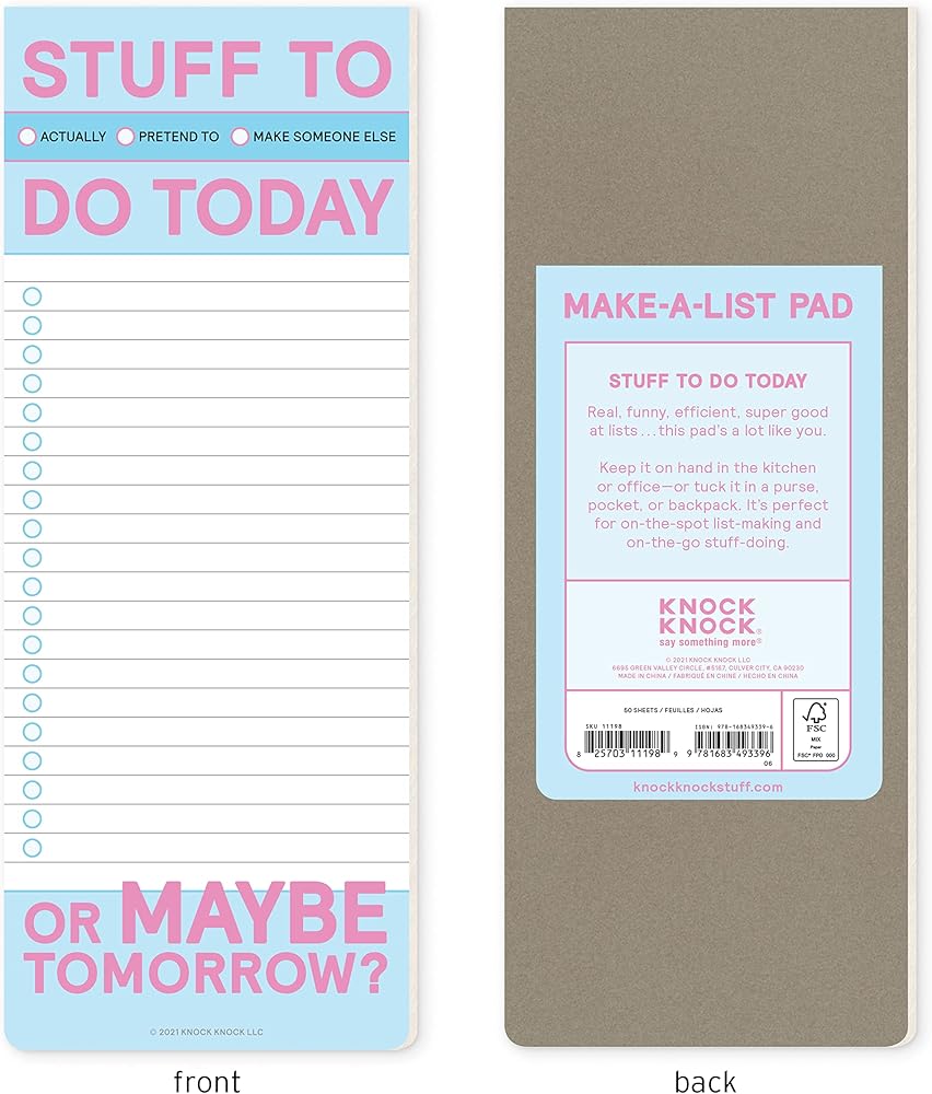 Includes: one (1) list notepad, 3.5 x 9-inches, 50 sheets. Real, funny, efficient, super good at lists; this daily planner pad is a lot like you. Keep it on hand in the kitchen or office - or tuck it in a purse, pocket, or backpack. It's perfect for on-the-spot list-making and on-the-go stuff-doing. Knock Knock pads: making it happen since 2002. Because gifts for office coworkers can be fun and functional. Knock Knock is a maker of clever gifts, books, and whatever else we can think up; our mission is to bring humor, creativity, and smarts to everyday life. Put the fun in functional with Knock Knock stuff!