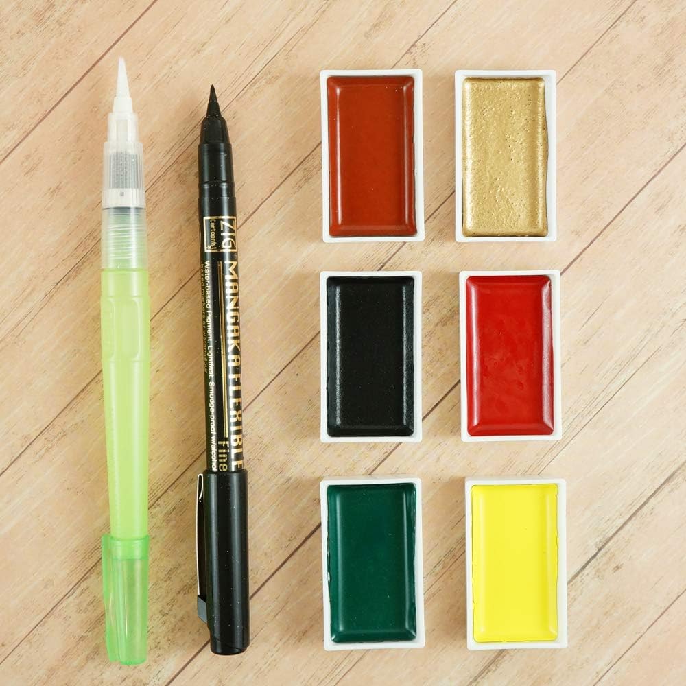 Includes the essential tools you need to draw a picture, all in a compact green colored Washi-paper box! Each set is packed with 6 Gansai Tambi paint colors, as well as travel-sized brush pen (MANGAKA Flexible Fine) and a water brush pen (Medium size).